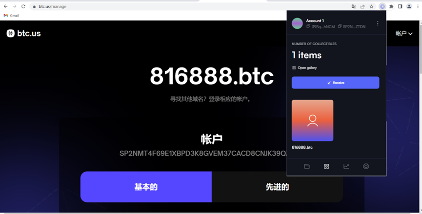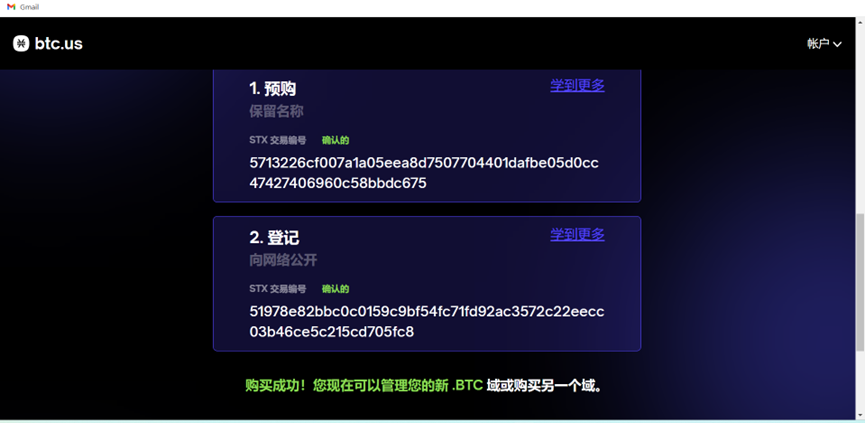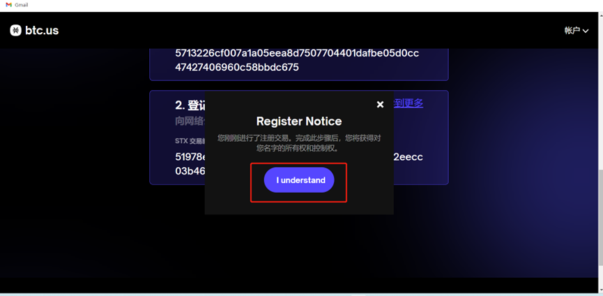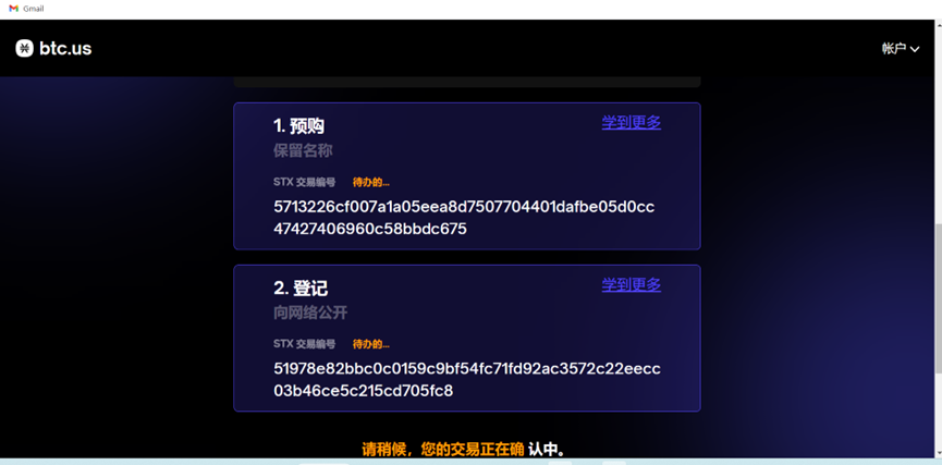 注意:每个地址只能注册一个域名,如果你用这个地址想申请多个域名,目前还不支持,如果你用有了域名的账户再申请另外的域名,只会burn你的stx,切记!
