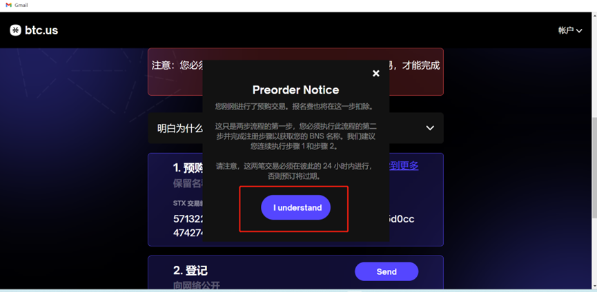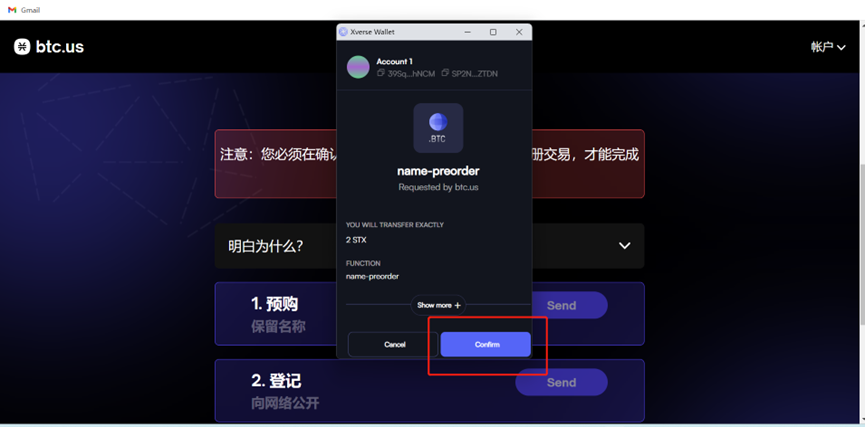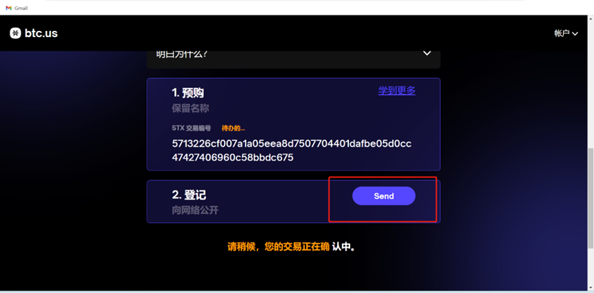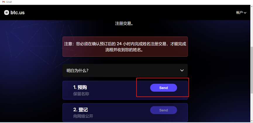 等出现注册交易界面后,在预购栏那里点击“send”,钱包签名确认。