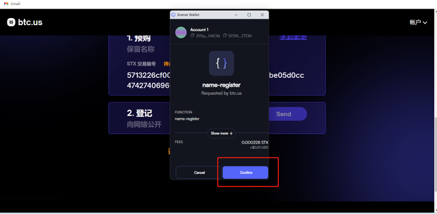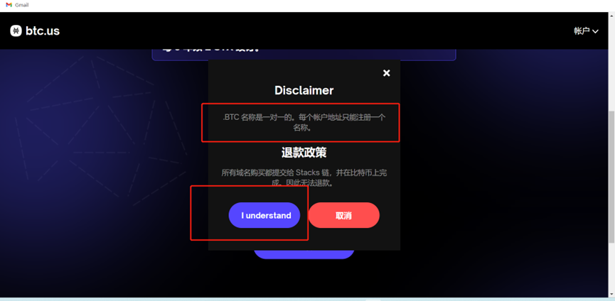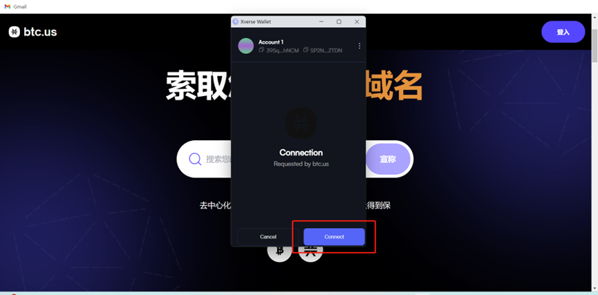 连接好钱包,注册你想要注册的.btc域名吧。选好想要的域名后,点击对话框右侧的“宣称”