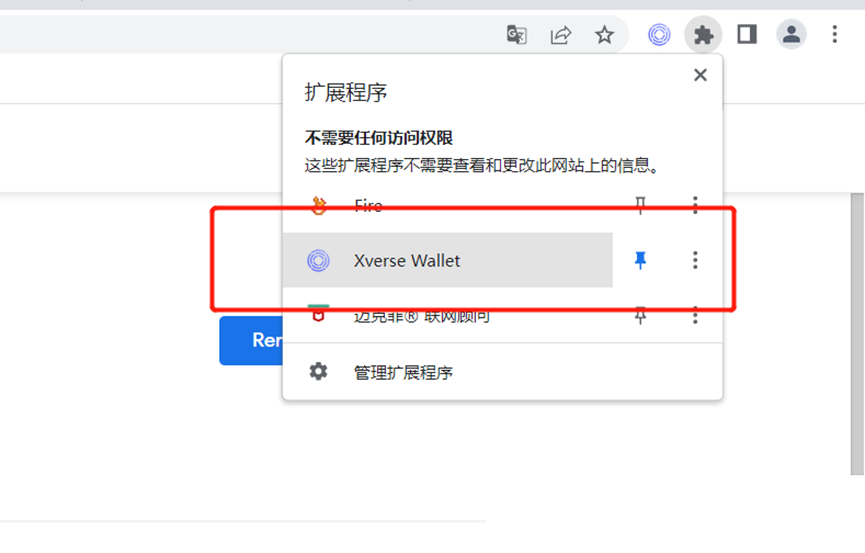 安装完成后,为方便操作,在浏览器右上角的扩展程序,固定钱包,如下图。
