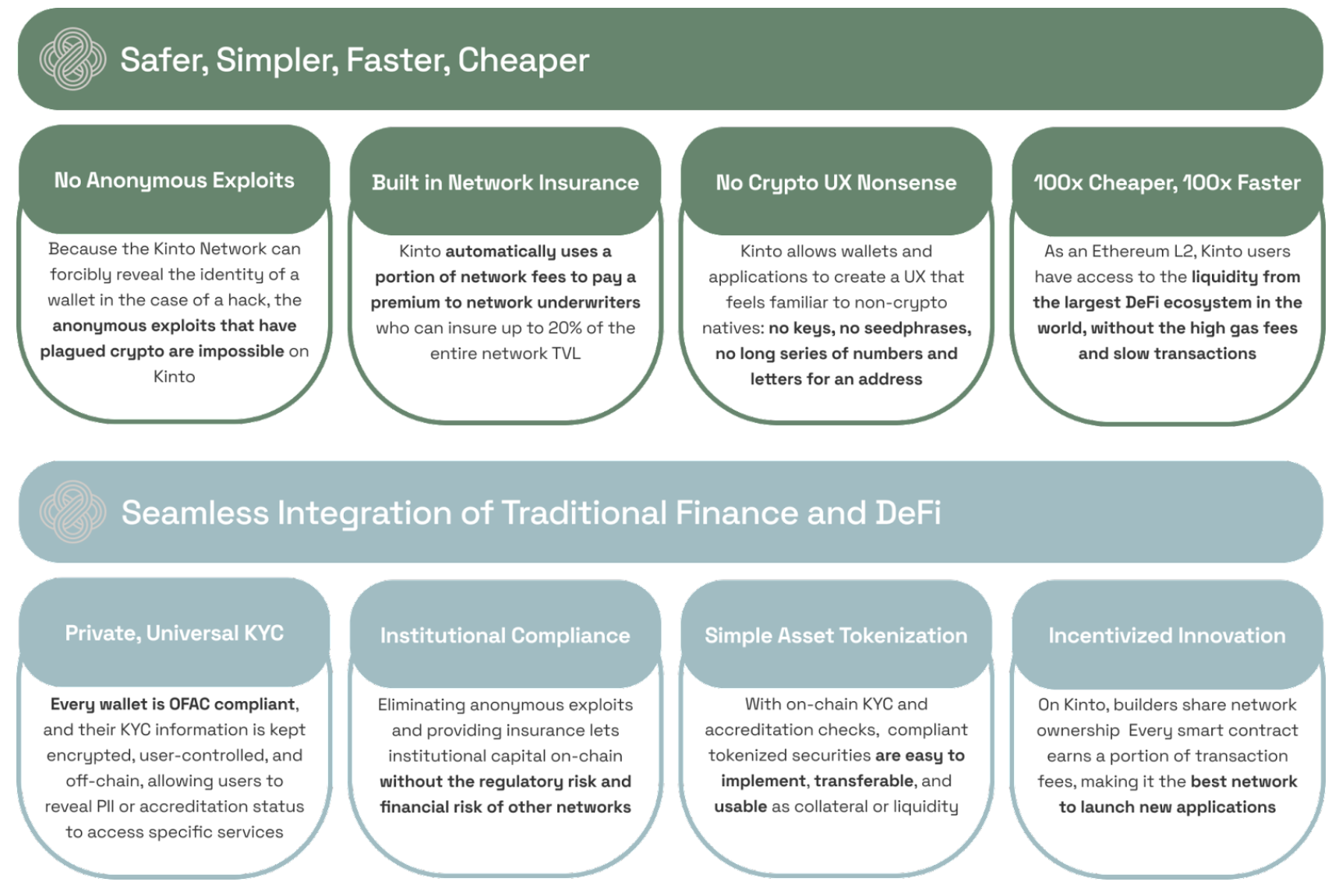 🧱 Composability. Right now, RWA assets cannot be easily composed with each other. Within Kinto’s rollup, asset issuers can create composability between assets with the same compliance requirements. Kinto also offers composability with native digital assets like ETH or stETH.