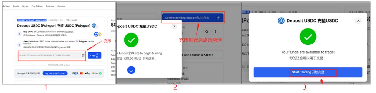 Polymarket 會直接產生一個錢包位址,需要從交易所或其他平台充值。充值的幣種是 USDC 。鏈上儲值到帳後,還需要點選 ‘Confirm pending deposit’ 來確認幣種的到帳和啟動。這些步驟完成後,就可以進行交易了。