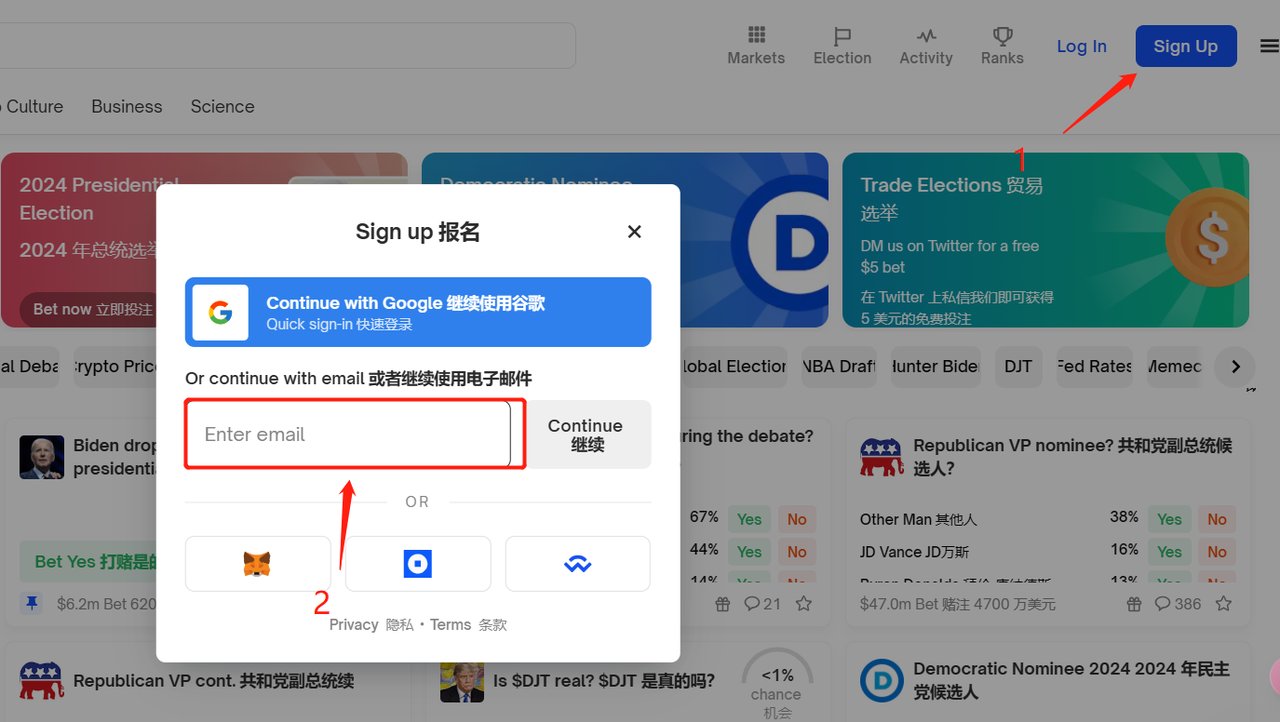 首先需要報名 Polymarket ,進入官網:https://polymarket.com/ 。點擊右上角的註冊按鈕,有兩種註冊方式:郵箱註冊和連結錢包註冊。由於 Polymarket 採用無密碼的電子郵件登入方式,因此建議使用信箱進行註冊。