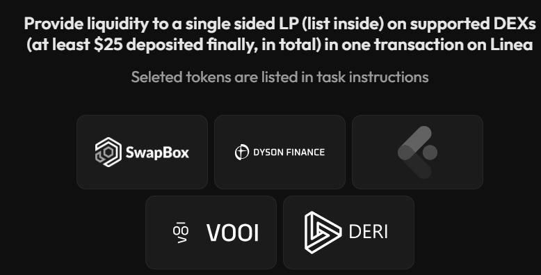 Provide liquidity to a single sided LP (list inside) on supported DEXs (at least $25 deposited finally, in total) in one transaction on Linea
