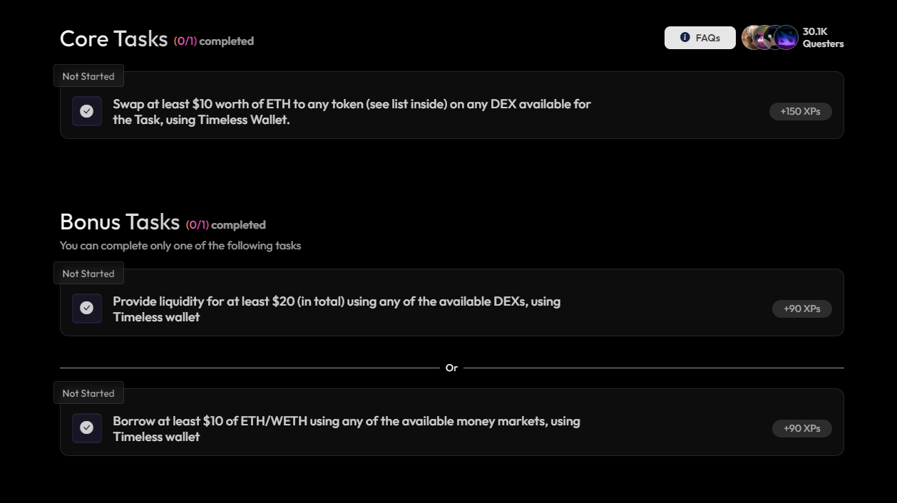 Provide liquidity for at least $20 (in total) using any of the available DEXs, using Timeless wallet