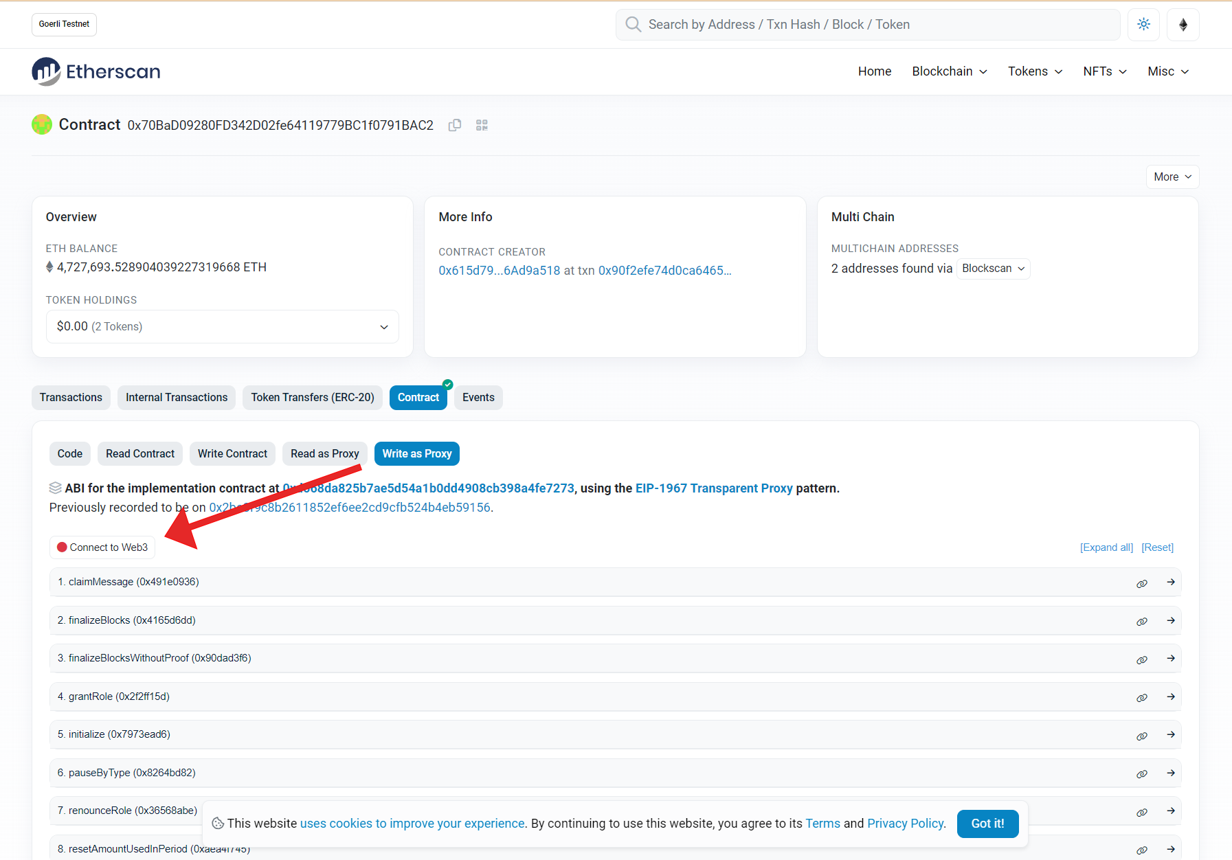 Once you have ETH in the Goerli network, navigate to https://goerli.etherscan.io/address/0x70BaD09280FD342D02fe64119779BC1f0791BAC2#writeProxyContract
