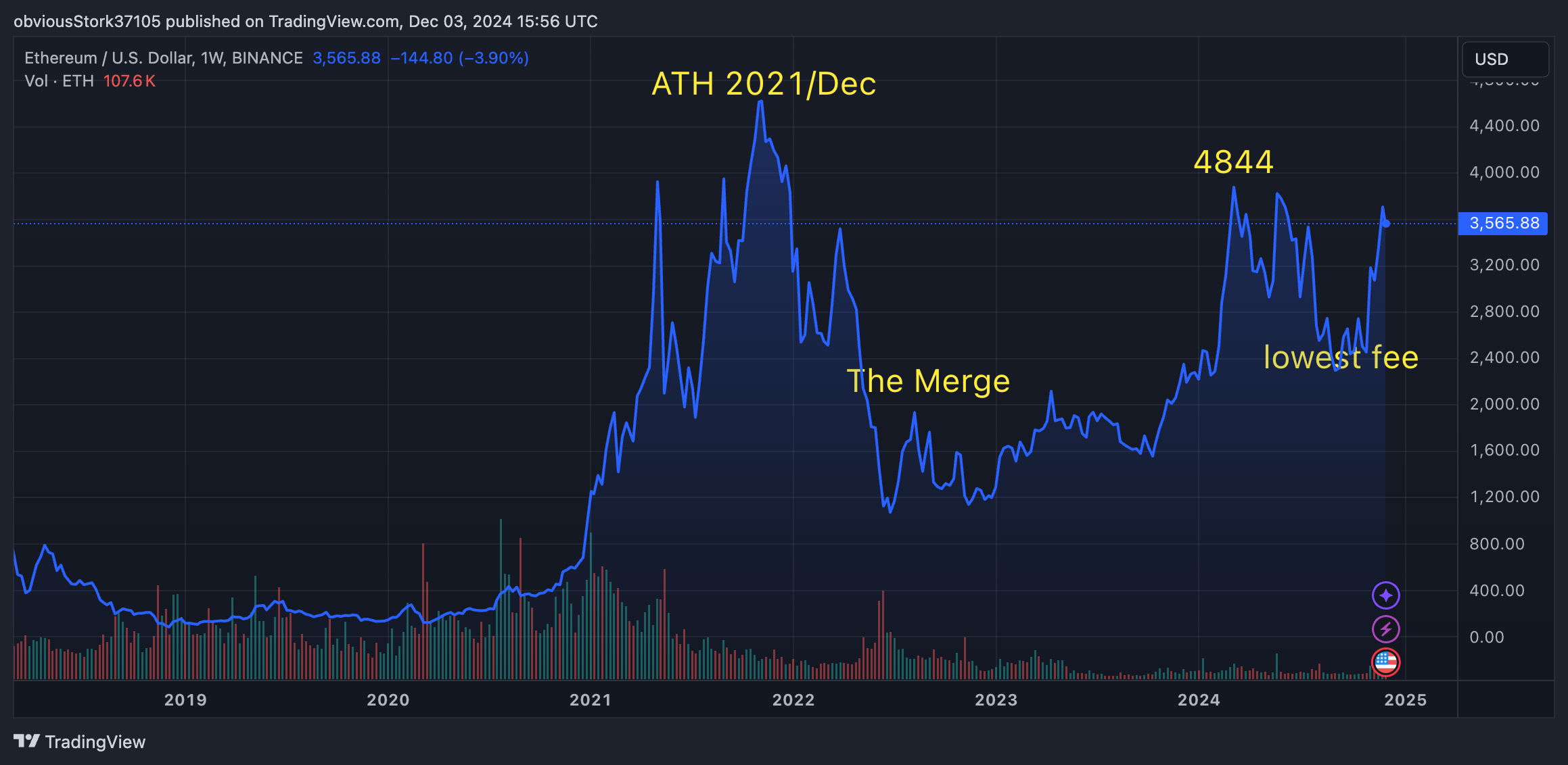 大牛市來臨,bitcoin直奔100k,solana也破新高260,唯獨ethereum就還在水底下面。這篇文章將為大家分享一下我的見解。