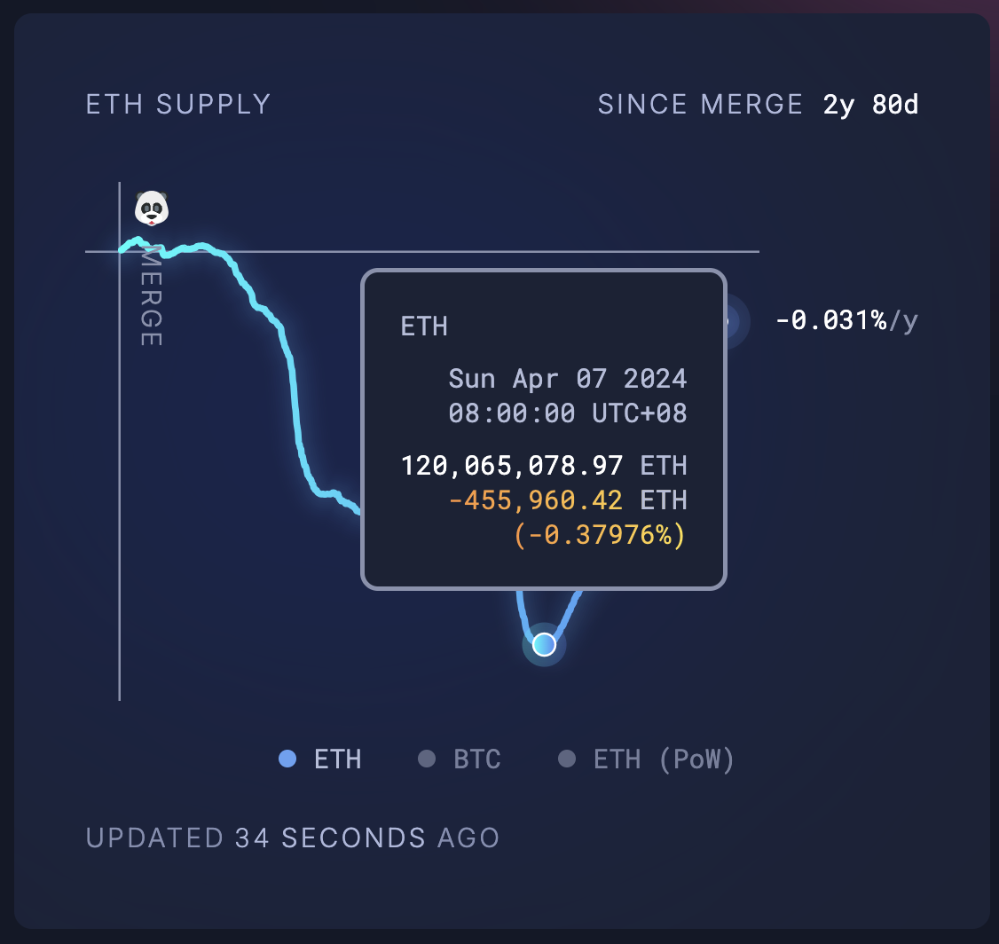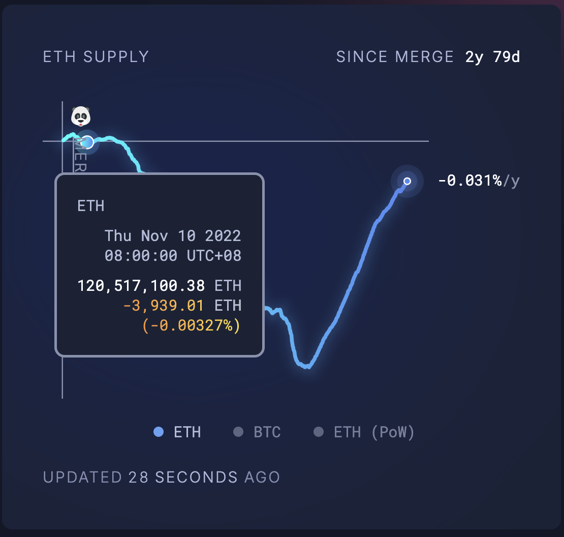 merge在2022年9月啟動,PoW鏈完成歷史任務,GPU挖礦停止釋放ETH,只剩下了PoS每個block派出微薄的ETH給予validators。於是乎,通漲大大降低,配合EIP1559的燃燒機制,ETH在2022年11月第一次達成了負發行(negative issuance),即時通漲比起燃燒低,ETH由無限發行的通漲型貨幣搖身一變變成了通縮型貨幣。
