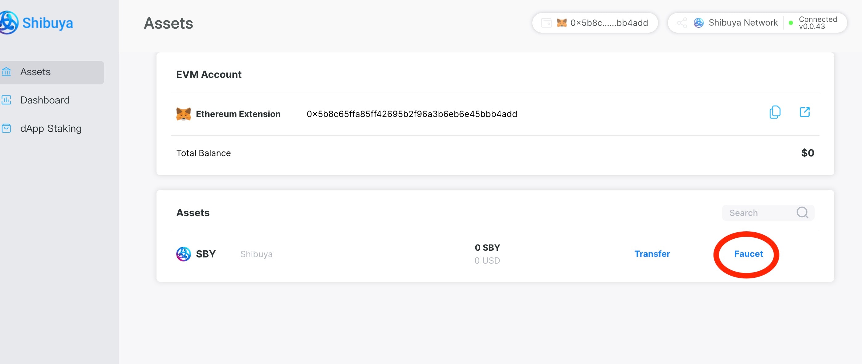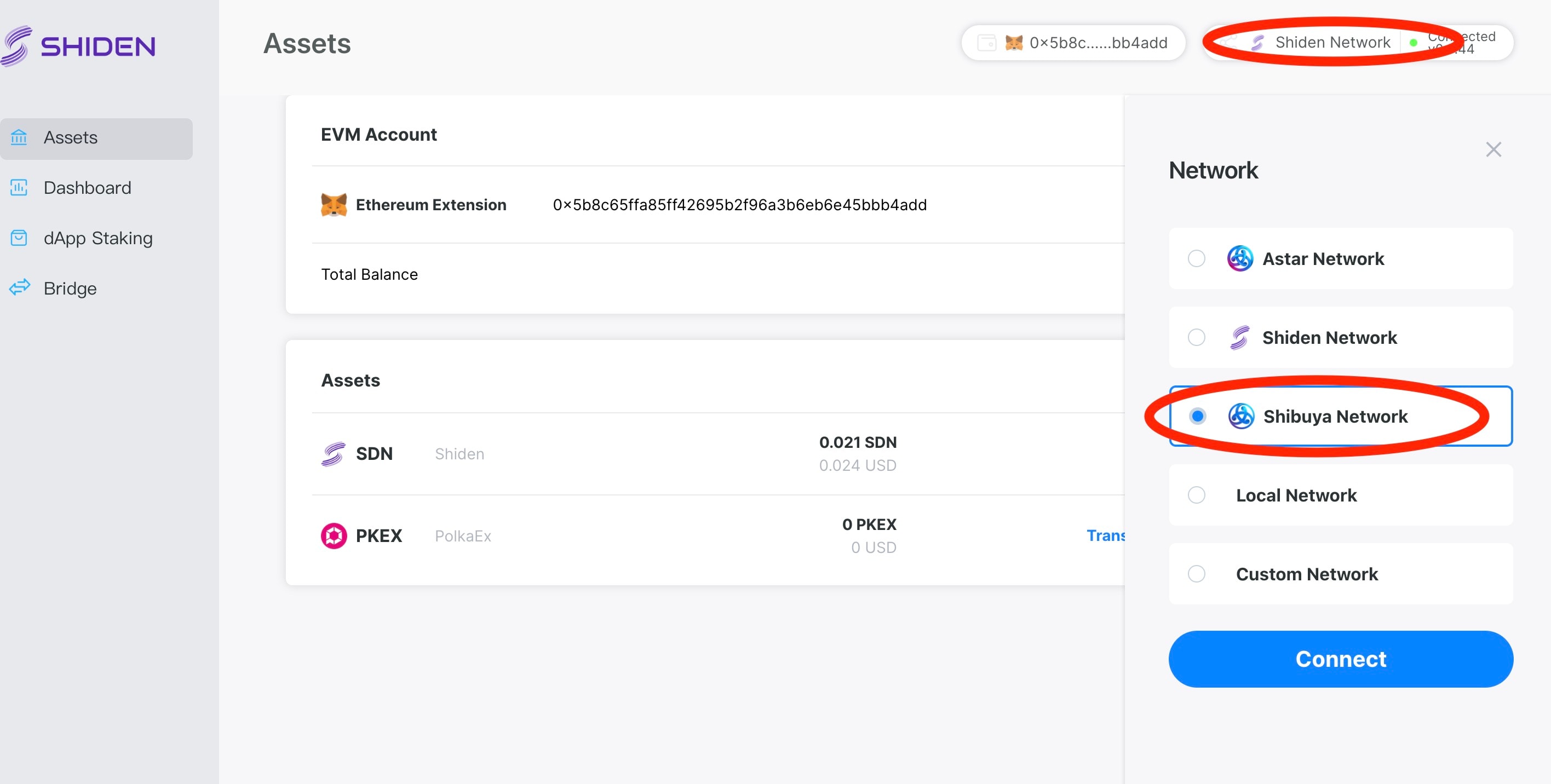 1,打开Astar Network网站并连接metamask钱包,并将网络切换到Shibuya Network。