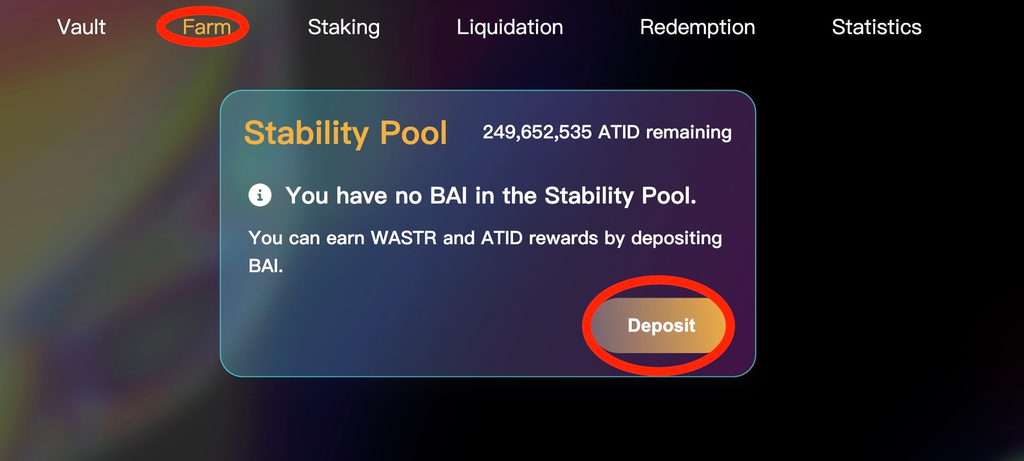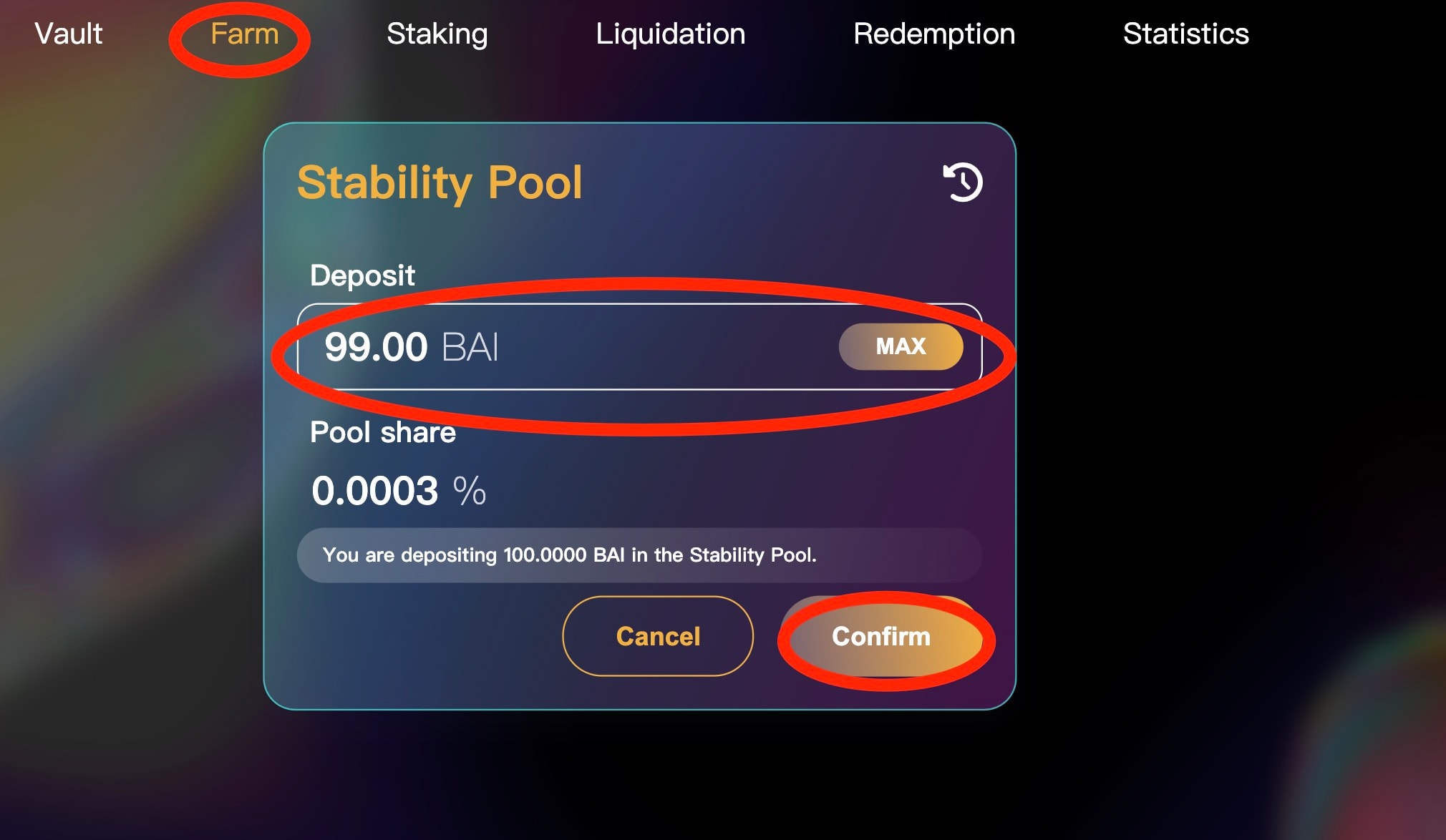 6,然后点击农场,点击定金,把借来的BAI存入稳定池。