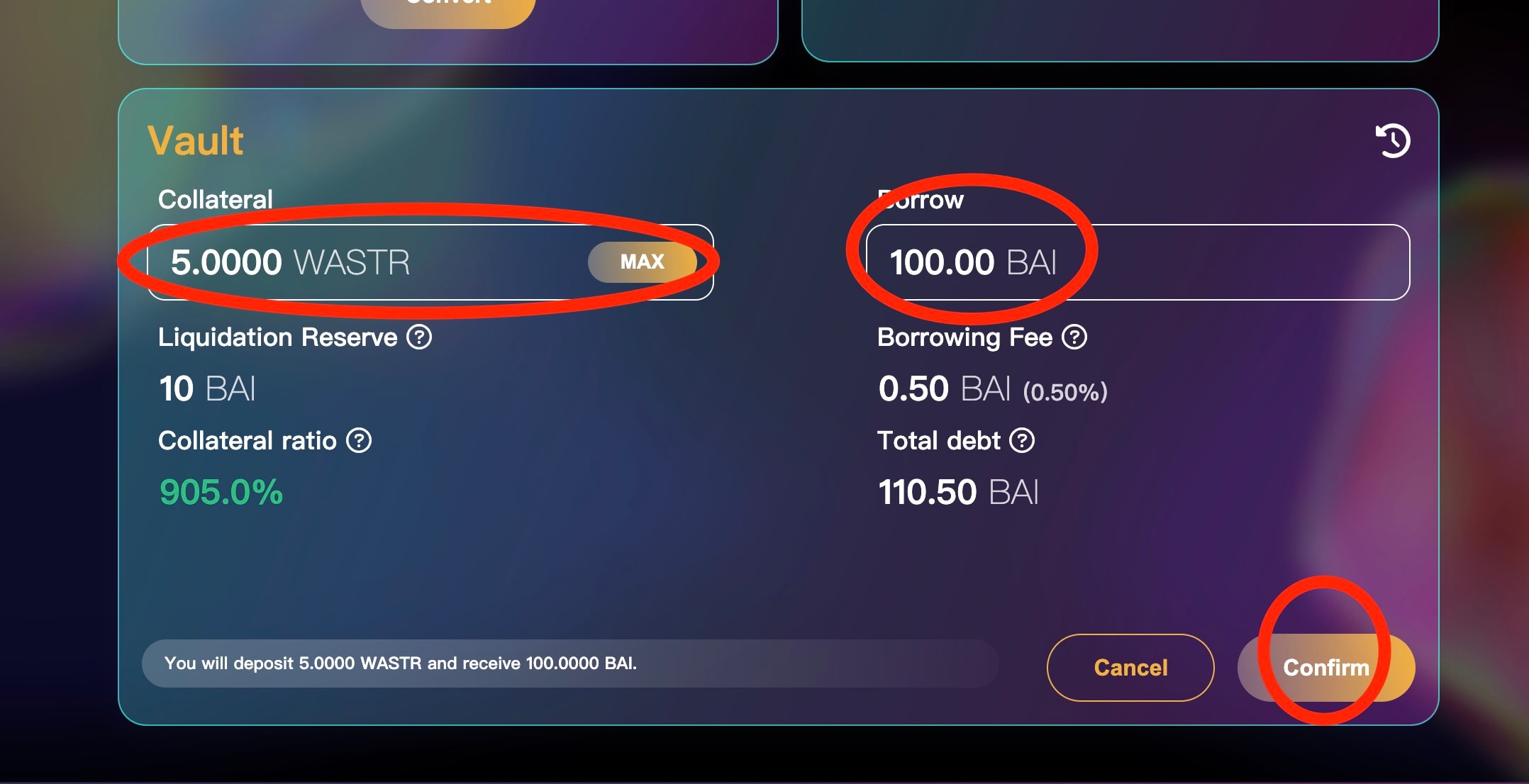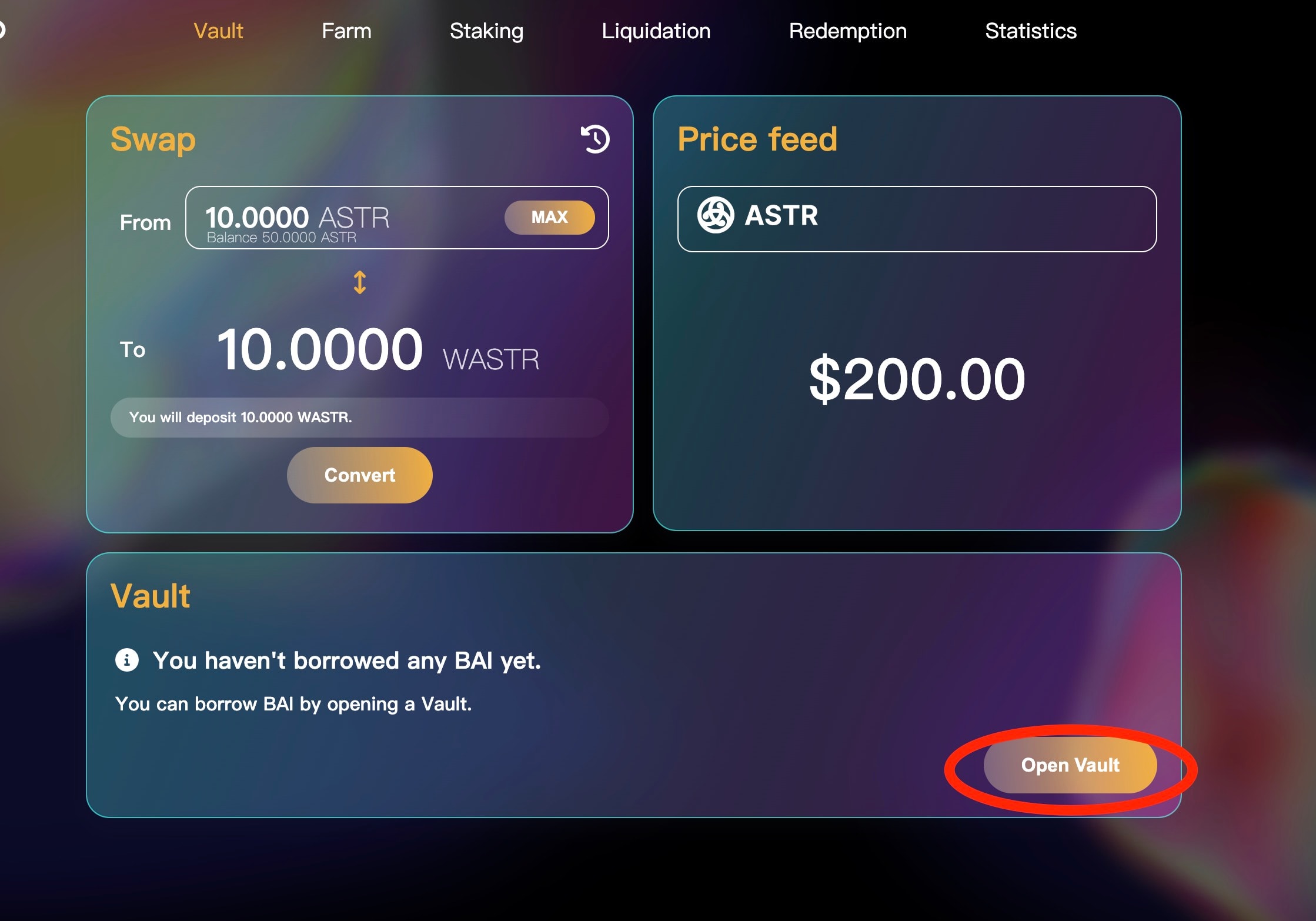 5,然后点击打开保险库,输入抵押金额并借款确认。