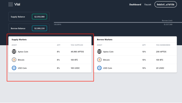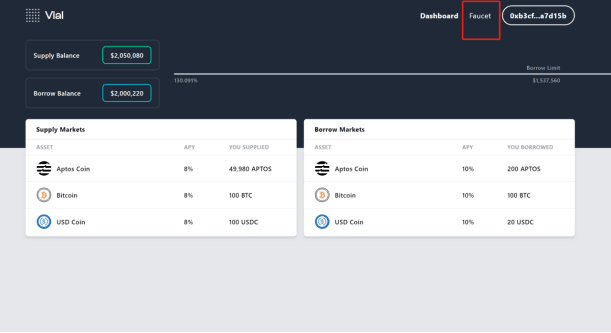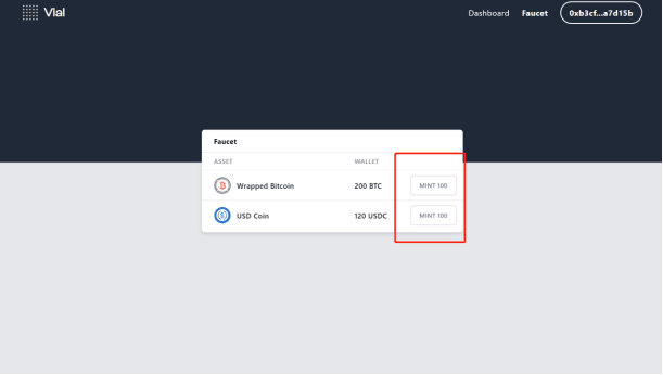 4、领取测试币后打开借贷协议的官网https://www.vial.fi/app,然后点击右上角faucet领取BTC和USDT的测试币