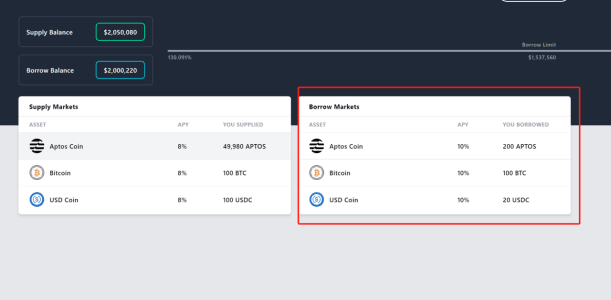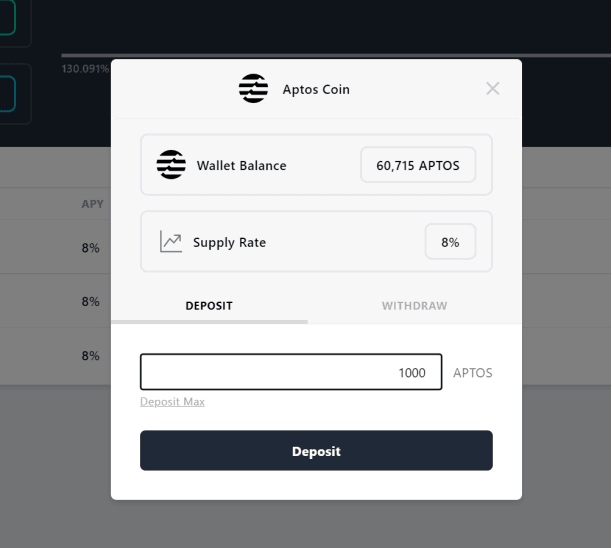 选择要质押的aptos数量,然后点击deposit,三个测试币都要质押一下做交互