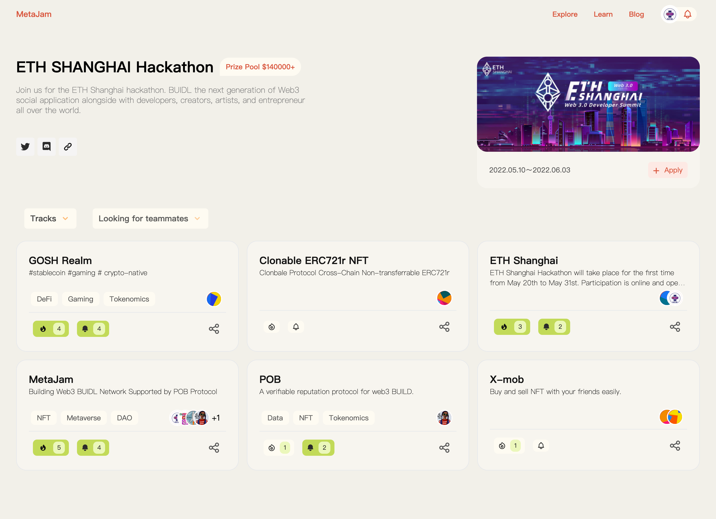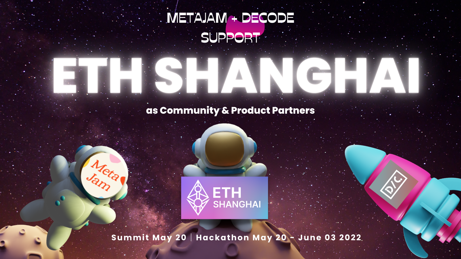 2022 ETH Shanghai Hackathon is kicked off on May 20. As the community support partner of ETH Shanghai Web 3.0 Developer Summit and Hackathon, MetaJam has officially launched the ETH SHANGHAI Hackathon page!