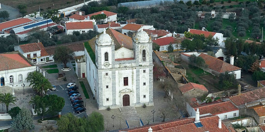 The Royal Basilica is located next to Praça do Município, in the center of Castro Verde. It consists of a large building, which easily stands out from the urban fabric of the village, being visible from a great distance. It features a floor-style planimetry, normally used in religious buildings built at the end of the 16th century, although both the facade and the interior were later modified. Its plan is longitudinal, with several volumes organized in a differentiated way. The building is surrounded by a cobbled churchyard, which is bordered by a viewpoint, Rua D. Afonso I and the Town Hall complex. The façade is divided into three registers, opening on the first to the church's main door, with a rectangular frame, flanked by Ionic pilasters and topped by a pediment where the arms of the Order of Santiago stand out. Above the portal is a window with a rectangular frame, which is later finished off by a gable. The façade is marked by two imposing bell towers, square in plan, ending in bell-shaped pinnacles and spires.