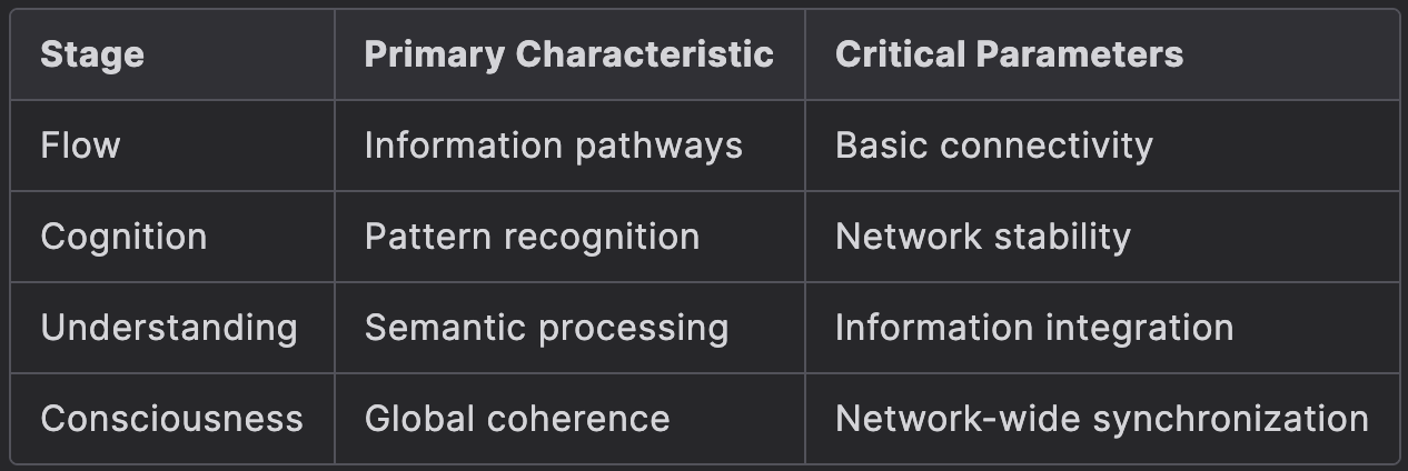 Connectivity Requirements: The observed 0.94 connectivity ratio falls below CFT's predicted minimum of 6 connections per particle required for basic intelligence emergence. As predicted by the theorem, this insufficient connectivity prevents stable consensus formation.
