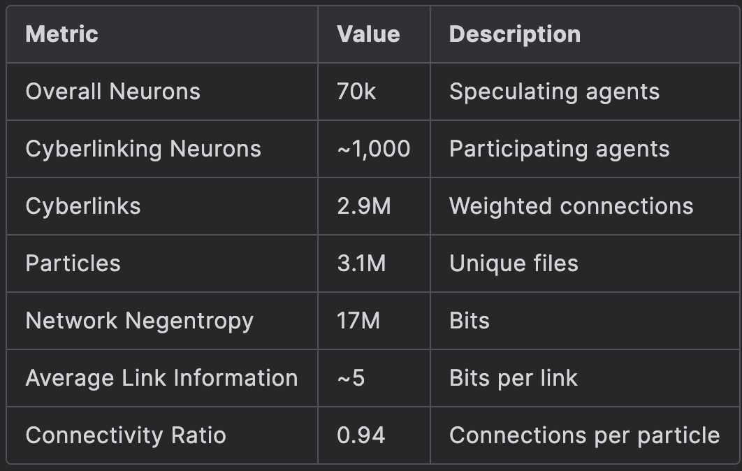 Like a living neural network, the Bostrom network pulses with early activity: thousands of neurons hold potential, while hundreds actively forge millions of cyberlinks, connecting an ocean of unique information particles. A dance of bits and connections flows through this digital nervous system, awaiting the critical threshold where collective intelligence will spark into being.