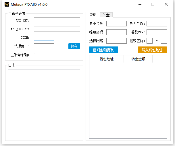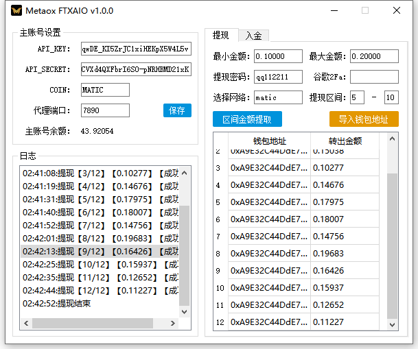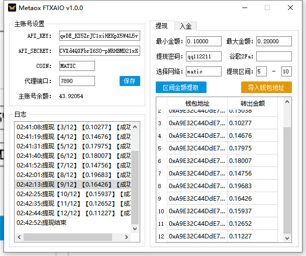 3.谷歌2fa选填,如果设置了提现使用谷歌验证,则需要实时填写(建议使用软件之前关闭,因为谷歌验证码只有30秒有效期,没有办法长期自动化)