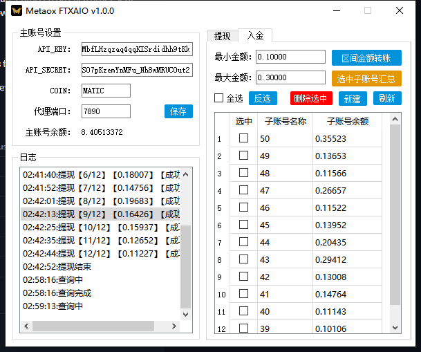 4.选中子账号汇总:可以将选中子账户里的所有的指定币转到主账户