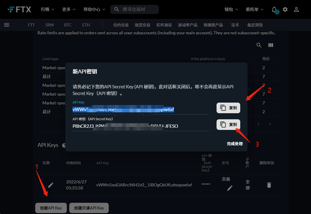点击创建API Key,并且复制API Key和 API密钥,点击完成处理。
