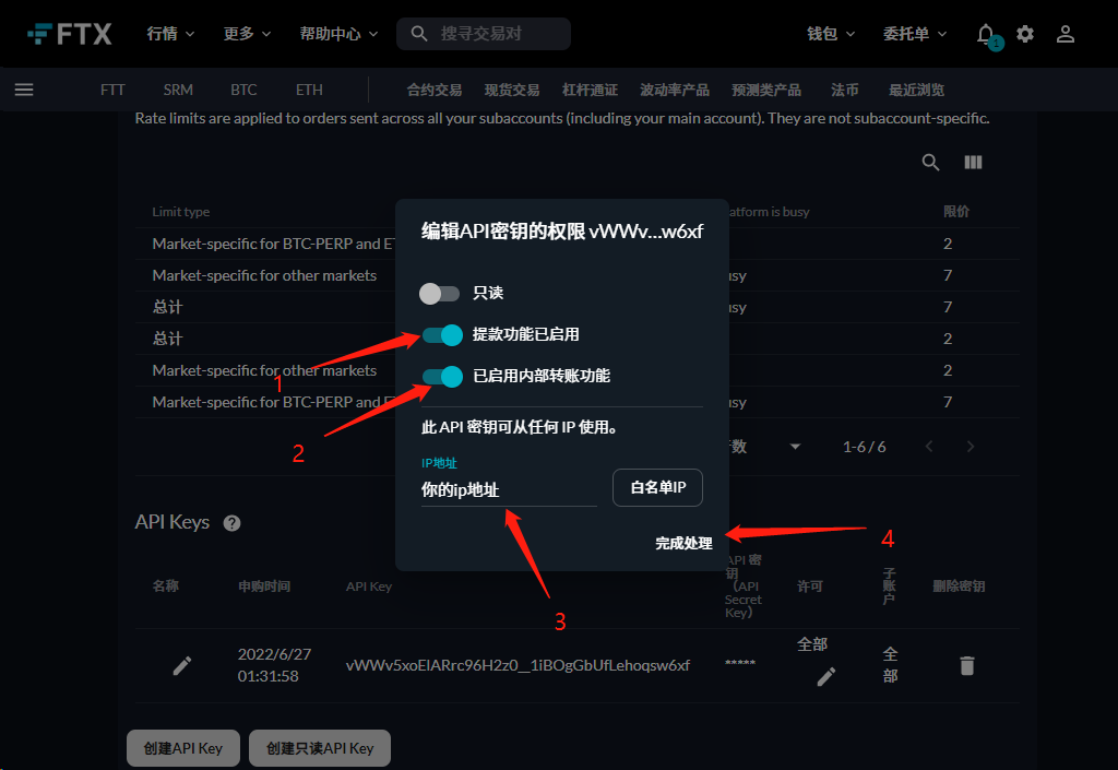 勾选提款功能和内部转账功能,并将该软件使用的ip地址加入白名单。这样非白名单的ip无法使用。最后点击完成处理。