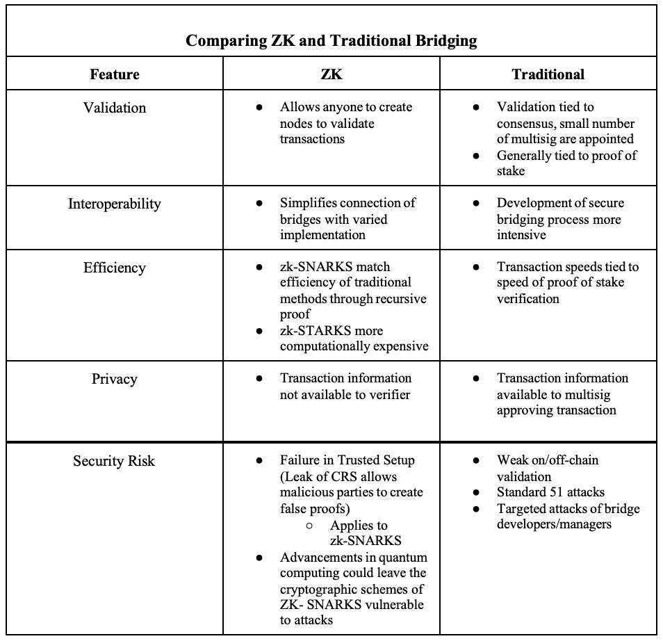 With the current zero-knowledge technology, we believe that a bridge built with zk-SNARKS would be more secure than traditional cross-chain bridges, while also being reasonably economical and computable. Improvements to the security and efficiency of zk-SNARKS could be crucial to how quickly the technology is adopted for bridging, but we do not believe that further improvements need to be made for a zk-SNARK based bridge to outperform the most widely used bridges of today. The use of zk-STARKs for bridging with current optimizations is idealistic. Although zk-STARK setups have no notable security concerns that we could uncover, such implementations are much too computationally intensive for mass adoption. We can not rule out zk-STARKS for bridging entirely, however. If future innovations can make zk-STARK systems more efficient, it may be preferable to use zk-SNARK based bridging as opposed to a less robust zk-SNARK bridge.