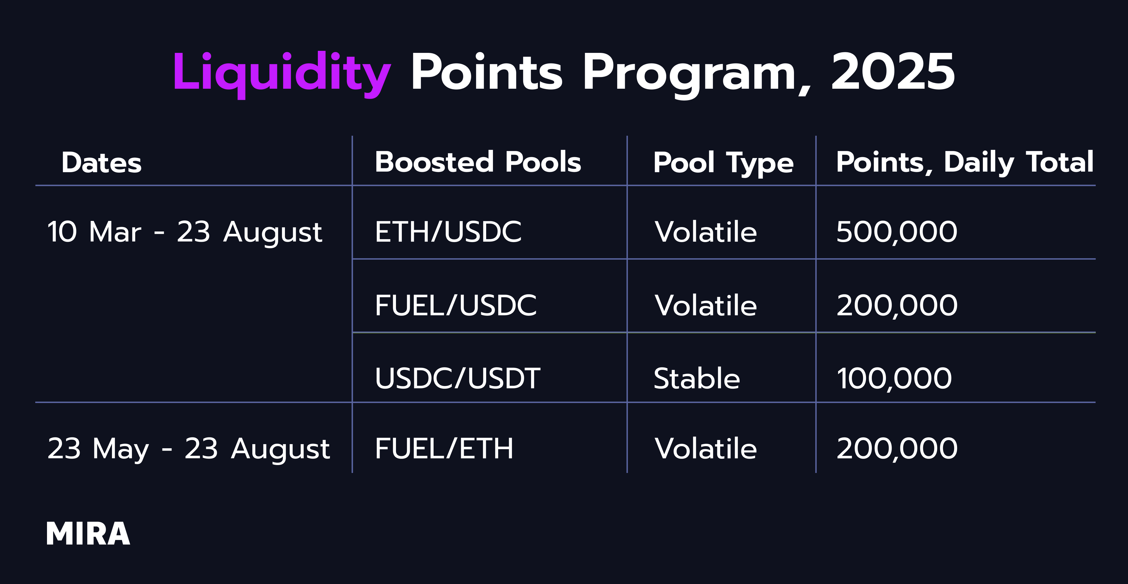 From 10 Mar 2 PM UTC to 23 August 2 PM UTC 2025, only four pools are included in the MIRA Point Program rewards. Check the details in the table depicted below.