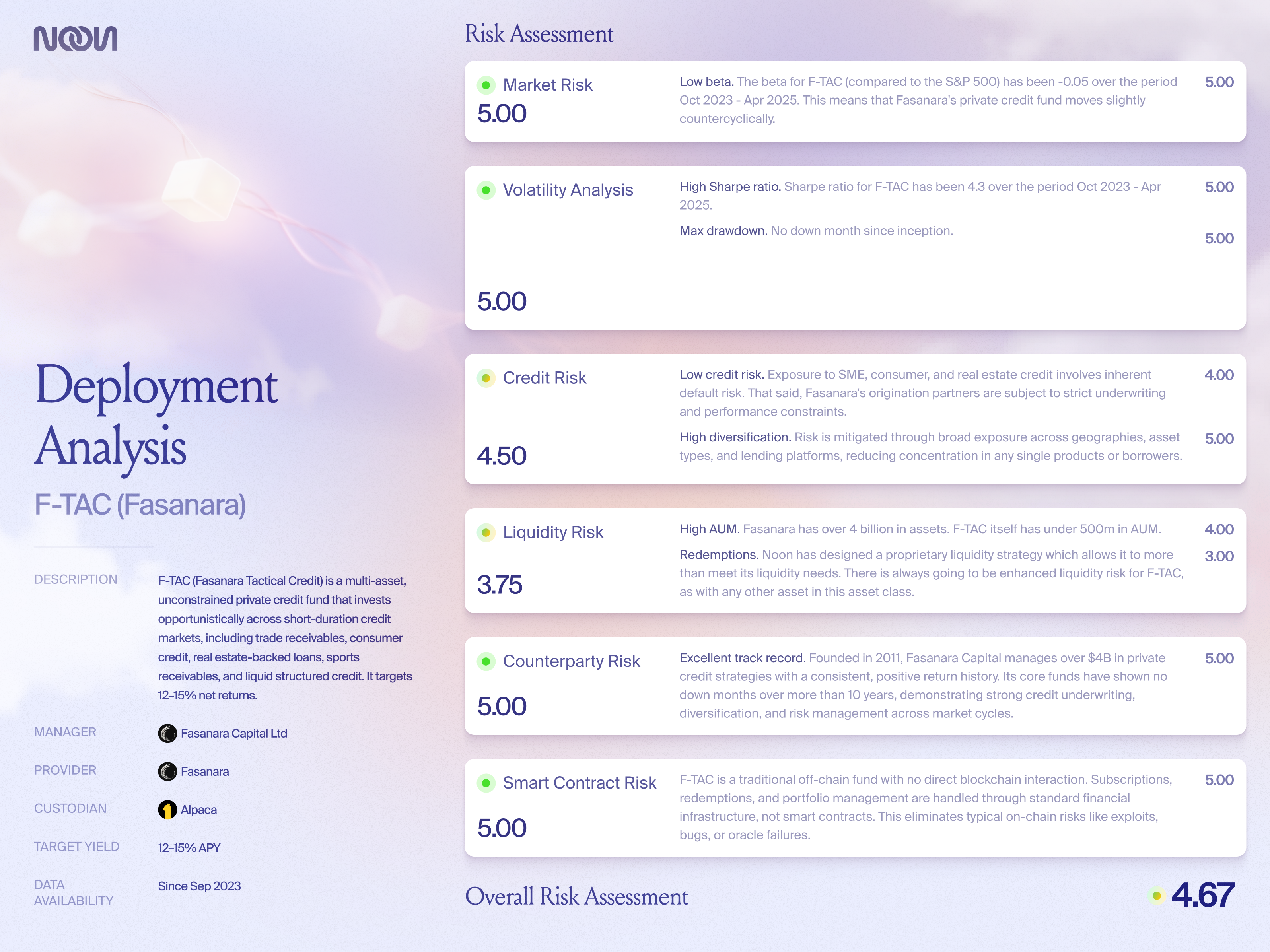 Combining F-TAC with Noon’s proprietary liquidation strategy meets all four criteria. F-TAC itself is uncorrelated with major equity indices, deeply diversified across originators and geographies, and can be wrapped in a tokenized representation without exposing users to smart contract risk.