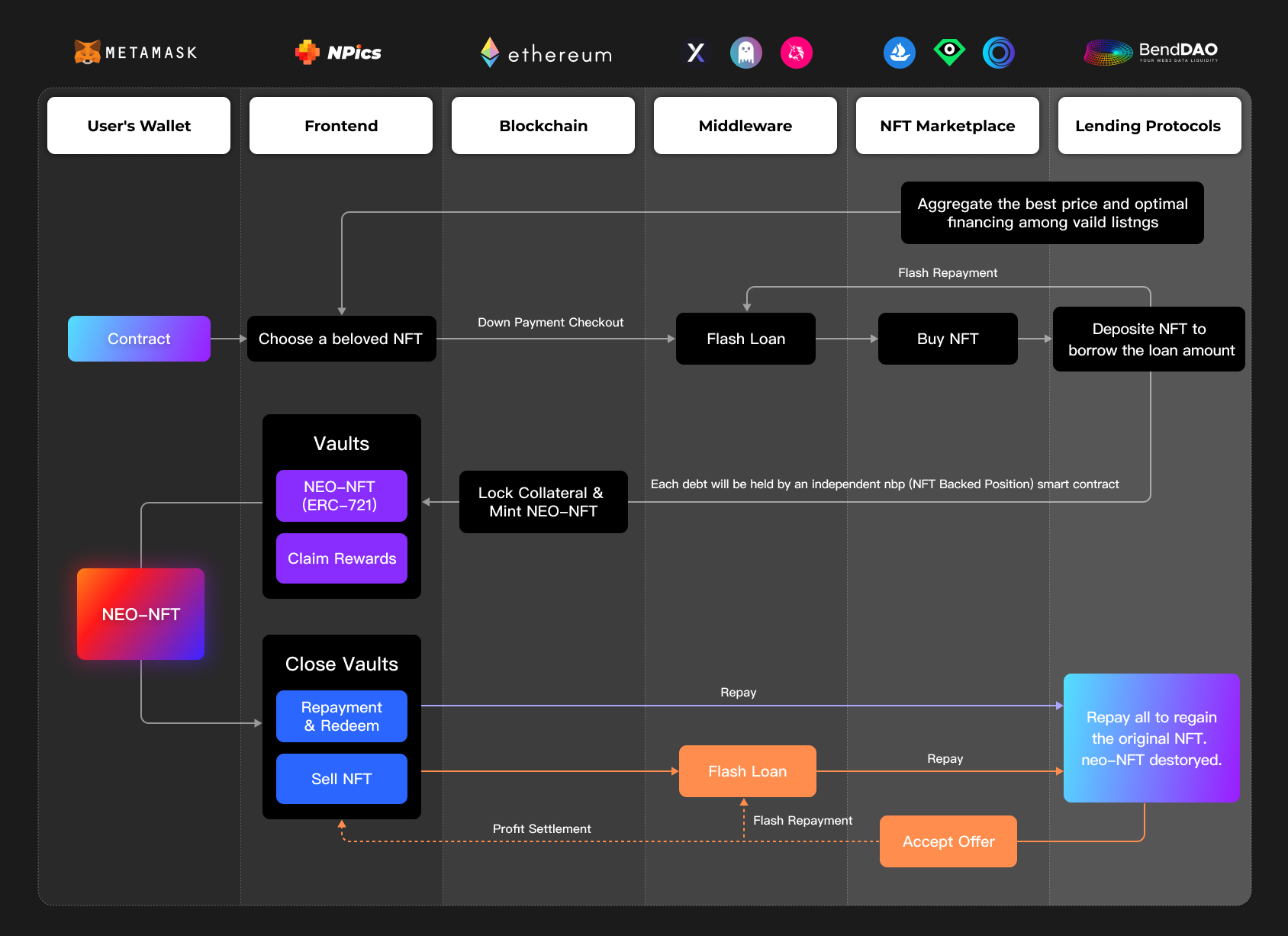 NFT Backed Position (NBP) protocol innovatively integrates batch of smart contracts to realize NFT leveraged trading, which effectively reduces participation cost of Blue-chips, while improving capital utilization and maximizing benefits. We have specifically implemented the process as a flow chart of three steps for your understanding.