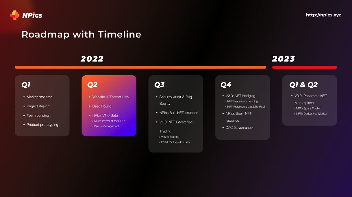 Our products have been primarily built on financial instruments that build NFTs. With multiple financial tools as the lever and NFT trading as the fulcrum, NPics help users stimulate, maintain and accelerate the growth of NFT liquidity. We have divided the development into following three phases stated as below.