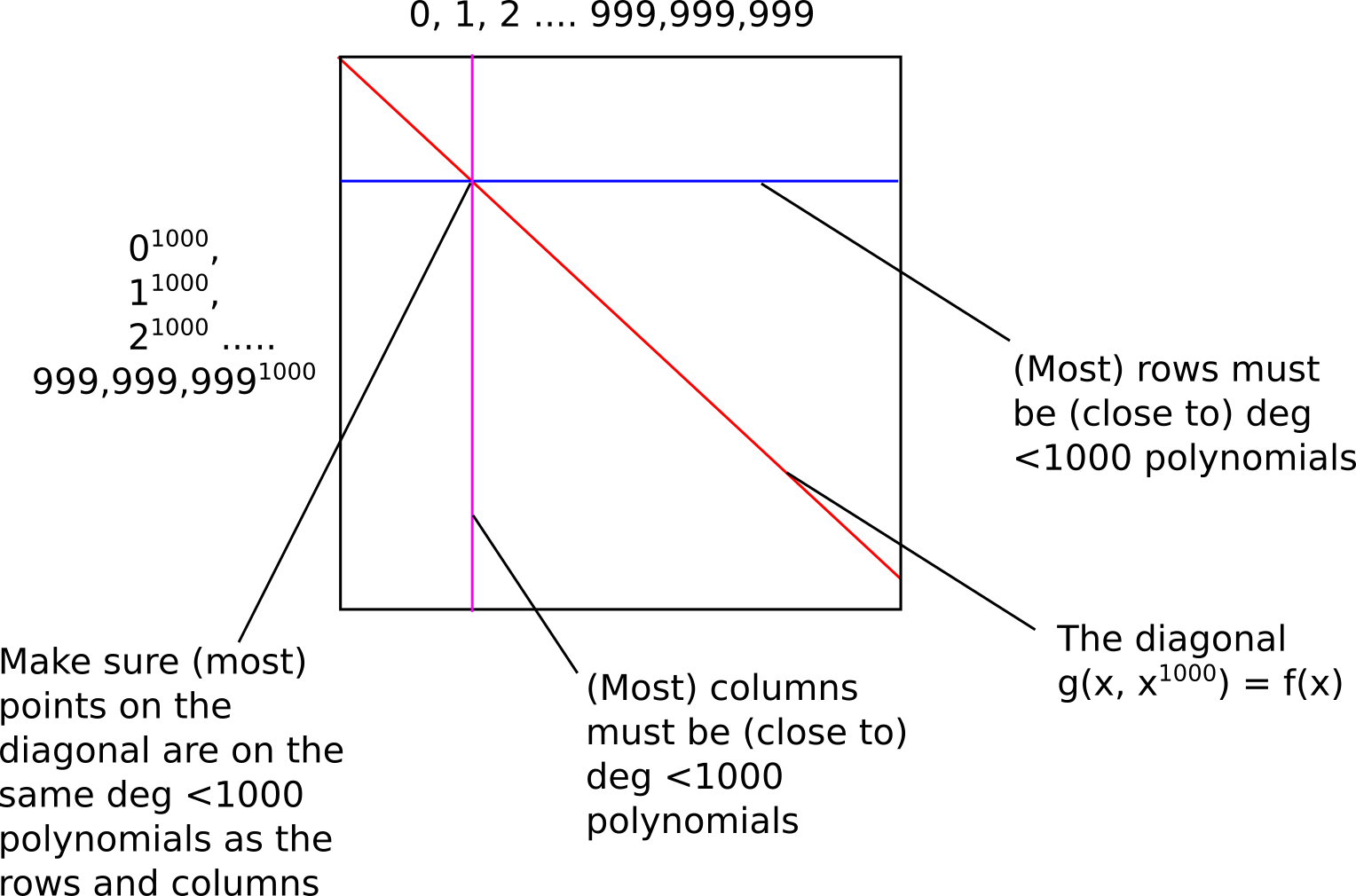The prover evaluates g(x,y) over a large square. The diagonal of this square represents the values of g(x,y) that match the values of f(x).