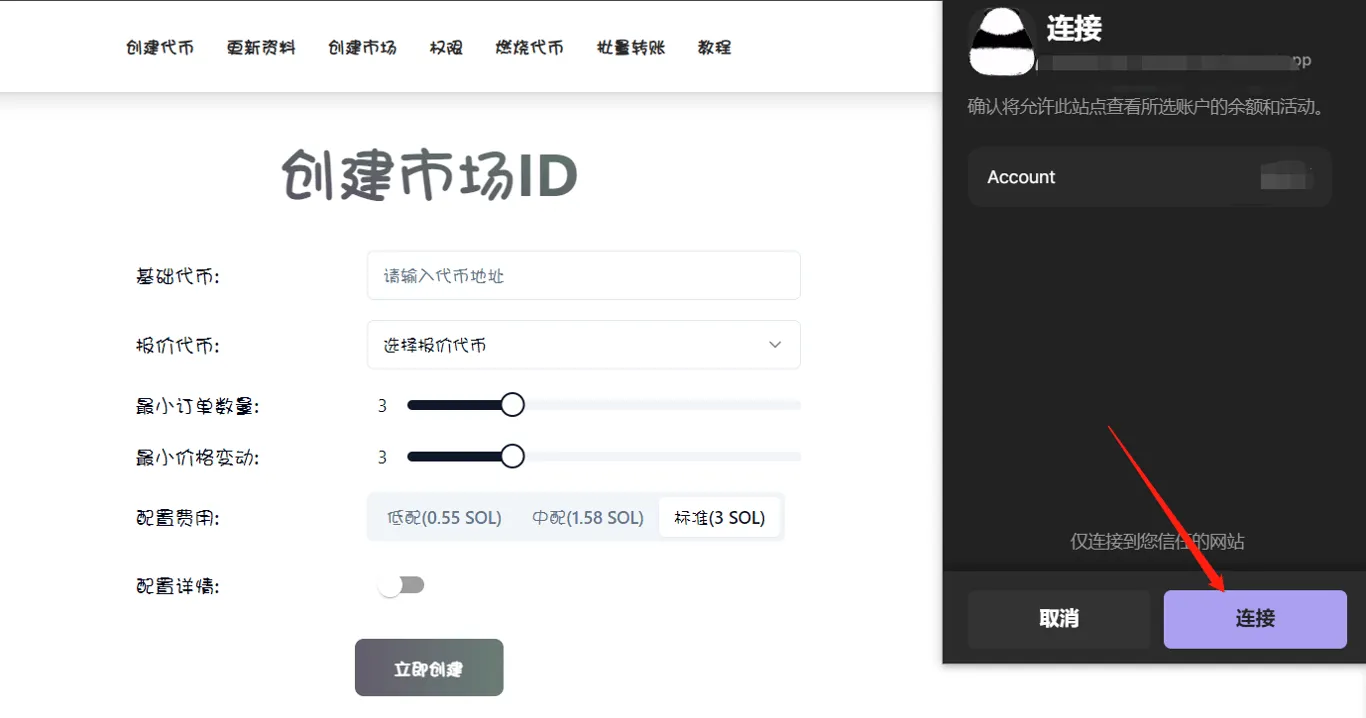 首先,我们打开PandaTool的ID创建工具页面https://solana.pandatool.org/market,右上角点击连接钱包(如果已经连接,则忽略此步骤)