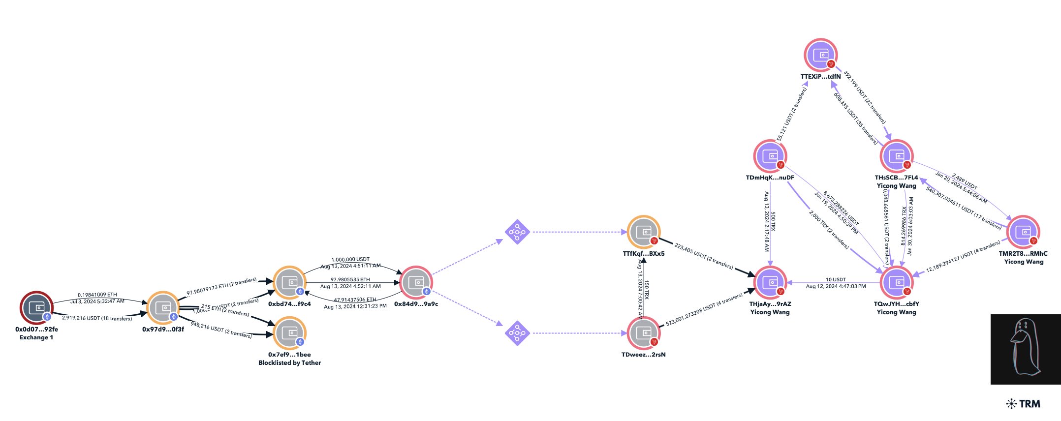 Tron Laundering: Blacklisted Ethereum wallets later transferred hundreds of thousands of USDT into Wang’s known Tron wallets, tying the activity to his OTC operations.