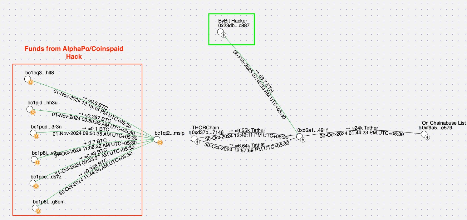 (bc1qt2wghg5xd346m06hmvrw0mnjwtfeeksagsmslp) was later linked to another BTC address (bc1qd5j8sd04hf4qem0x0ytl56w909nse4pgv9yt82) already associated with the AlphaPo/Coinspaid hack of 2023. This overlap revealed how the same laundering infrastructure was reused across multiple high-profile incidents, allowing investigators to connect the Bybit hack to past exploits.
