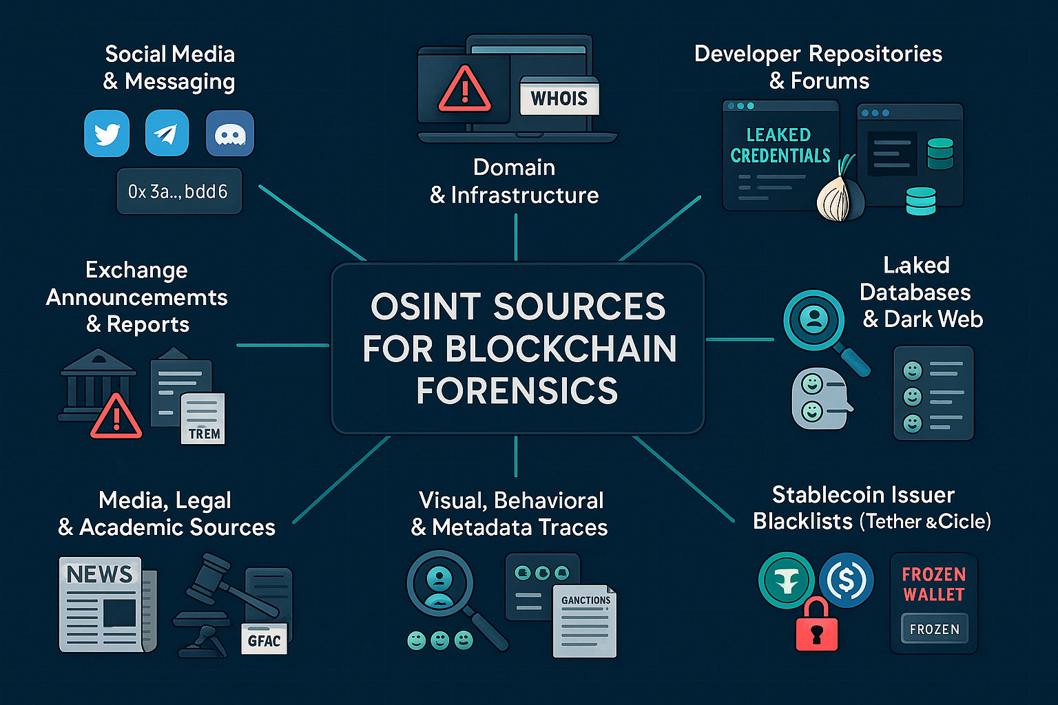 OSINT (Open-Source Intelligence) adds another crucial layer. Blockchain analysis shows how stolen funds move, and OSINT provides external context that can sometimes identify who is behind those wallets through linked communication channels, development activity, reused domains, or connected social media profiles. Investigators rely on attribution sources such as exchange records, public reports, and leaked data, and combine them with OSINT tools and techniques to connect wallets to real-world actors.