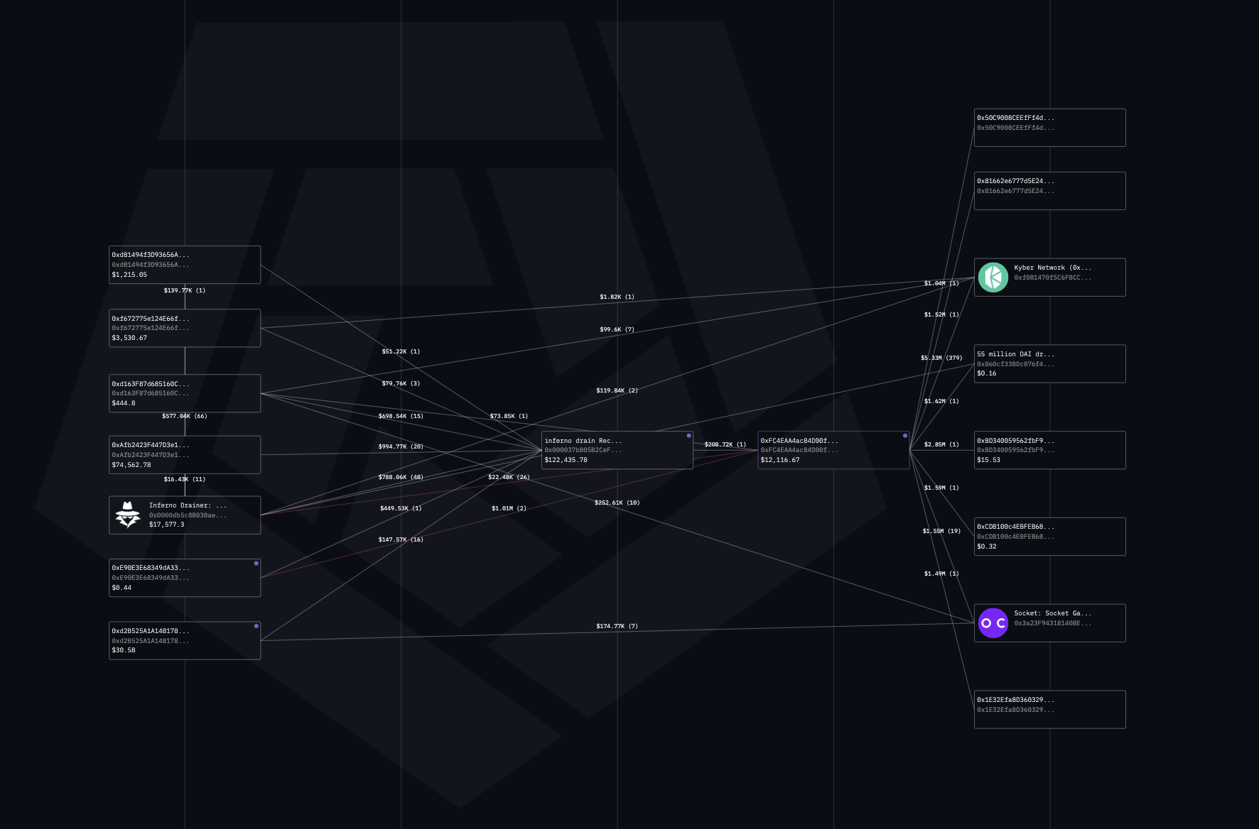 Example: The Inferno Drainer contract (0x000037bB05B2CeF17c6469f4BcDb198826Ce0000) illustrates how common input and output patterns enable attribution. Victim wallets from multiple phishing campaigns all funneled stolen assets into this same contract, which then forwarded the funds to attacker-controlled collector wallets. By observing the convergence of inflows and the redistribution of outputs, investigators were able to link separate scams back to the same malicious infrastructure.