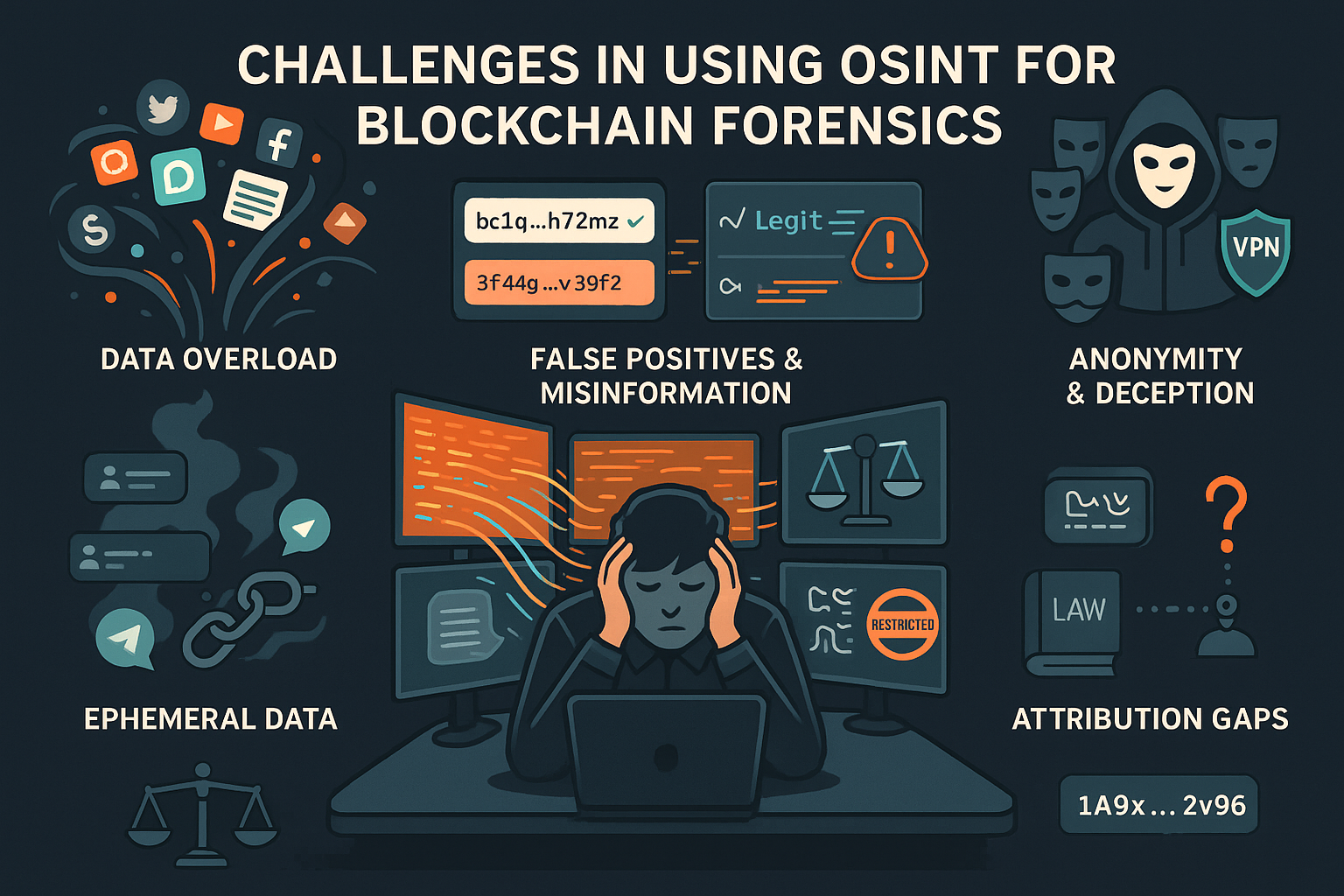 While OSINT is an invaluable tool in blockchain investigations, it comes with significant challenges that investigators must recognize and manage. Without careful handling, these limitations can lead to weak conclusions, misattribution, or even compromised investigations.