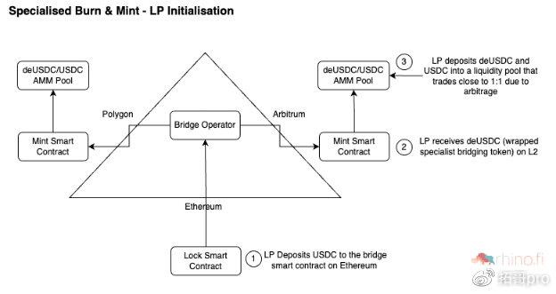 一些跨链桥协议将 “烧毁和铸造” 模型与 AMM 流动性池相结合。该流动性池可以包含两个或更多的资产,其中包括特别铸造的跨链资产。重要的是,就像 Lock 和 mint 桥一样,这种模型有助于在 Layer2 与其他链之进行快速资产跨链以及返回源链。 deBridge Finance 和 HOP 属于这一类。当用户将 ETH 锁定在一层以太坊上时,deBridge 会在 Arbitrum 和其他链上铸造特定的跨链桥通证(例如 deETH)。