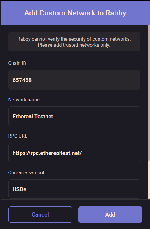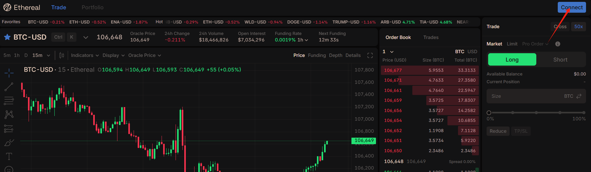 打开 testnet.ethereal.trade,连接任何 EVM 钱包(Rabby / MetaMask 等)。