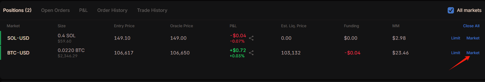 页面左下方会出现你当前的仓位,上图右侧箭头位置是两个关闭仓位的按钮,Limit 代表是限价关闭,Market 代表是市场价关闭。