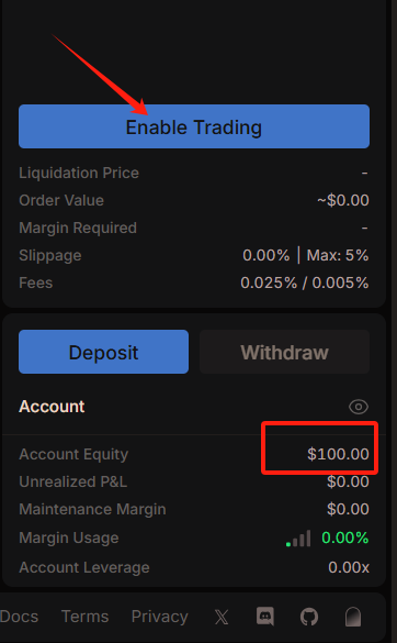 你会发现 100 USDe 测试币已经发放到位了,点击上图箭头位置 Enable Trading 按钮,会出现如下弹窗。