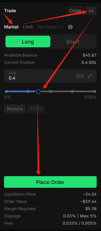 依照下图箭头位置,分别选择价格类型市场价(market)还是限价(limit)、杠杆倍数、仓位大小后,点击 Place Order 按钮下单。