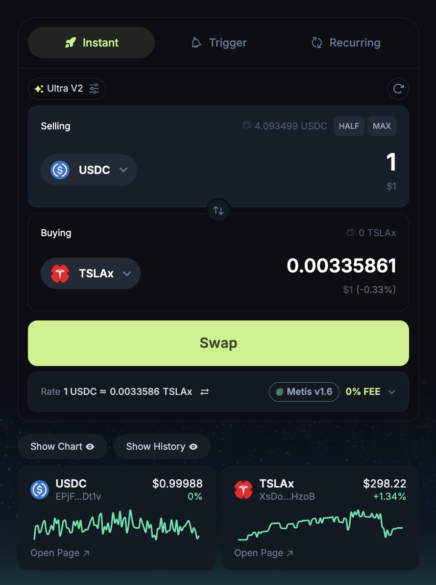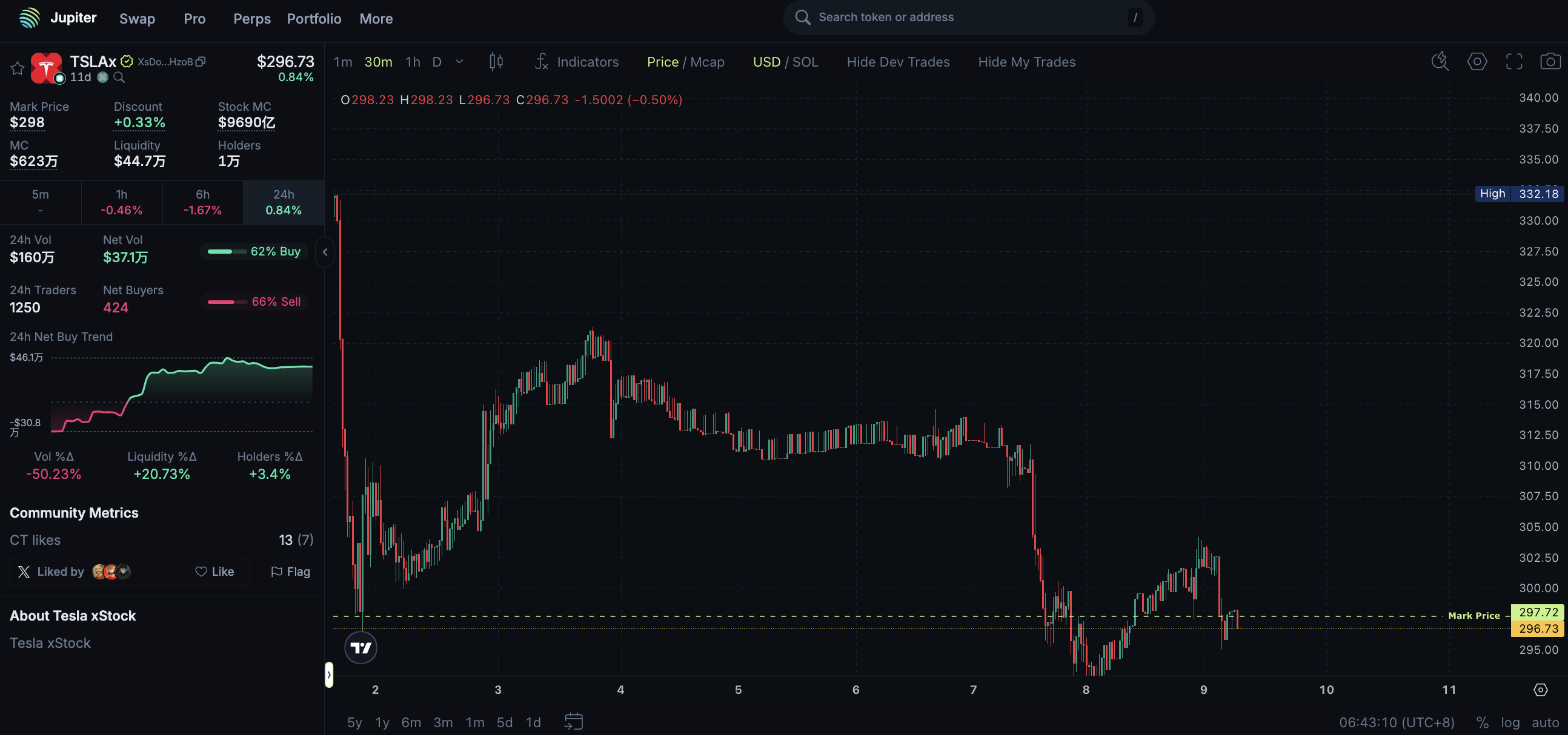 以 Solana 链上的 Jupiter 去中心化交易所为例,用户现在可以用 USDC 在链上随时买卖 TSLAx、AAPLx 等代币化美股,不受任何时间、地域或身份限制。这些代币的交易遵循 AMM 自动做市逻辑,全天 24 小时运行,无需等待开盘、无需匹配对手方、无需账户审核。