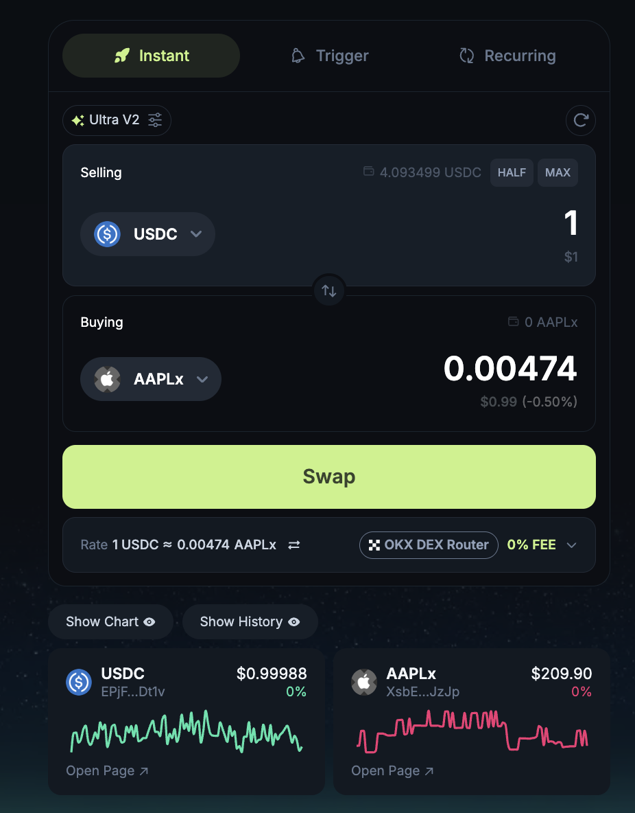 具体而言,你现在可以用 1 USDC 在 Jupiter 上买入 0.0047 份 APPLx。APPLx 是苹果公司股票在 Solana 链上的代币化表达,背后对应着现实世界里,由 SPV 托管人代表你持有的苹果股票。