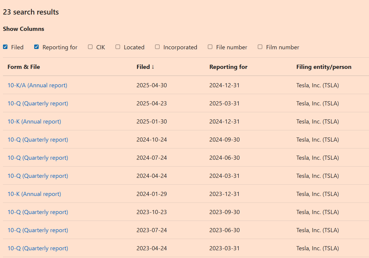 例如,你通过这个链接可以看到最新的 TSLA 的所有 10-K、10-Q报告。