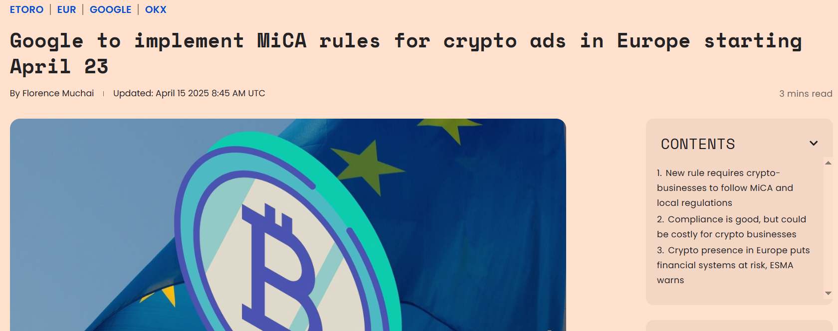 2025 年 4 月 23 日,Google 正式在欧盟地区执行《加密资产市场条例》(MiCA)下的新广告政策:
