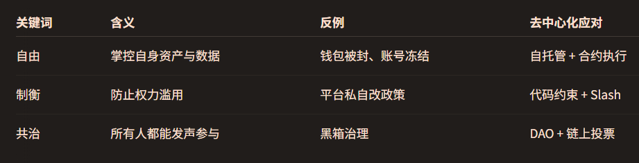 归根结底,去中心化的哲学价值可以用“自由-制衡-共治”三个词来概括: