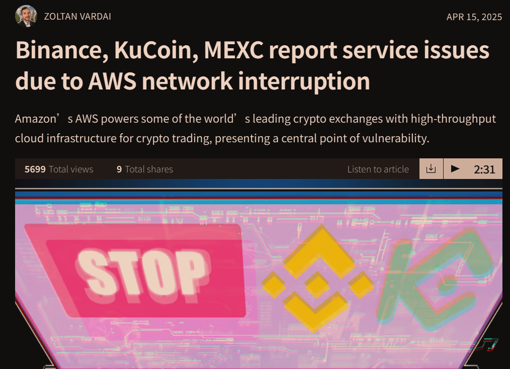 2025 年 4 月 15 日凌晨,日本东京时间 3:00,AWS(亚马逊云服务)东京区域突发大规模连接中断。在最初的 15 分钟里,Binance 的 API 响应时间暴涨 12 倍,MEXC 的用户提款请求排队超过 180,000 条,KuCoin 和 Gate.io 的挂单失败率飙升至 47.3%。