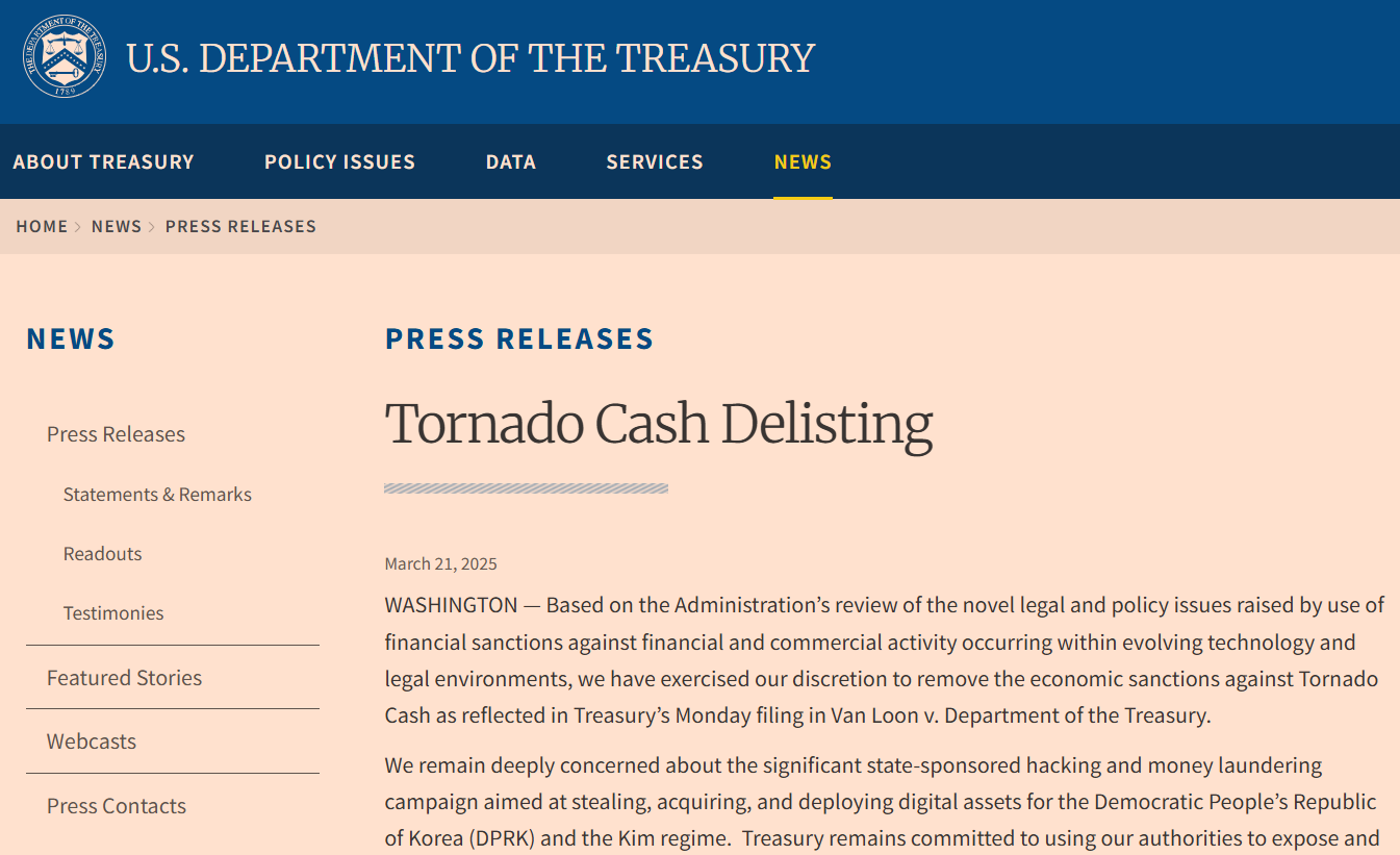 2025年3月21日,基于这一裁决和政策审查,美国财政部(US Treasury)正式移除对 Tornado Cash 的制裁。