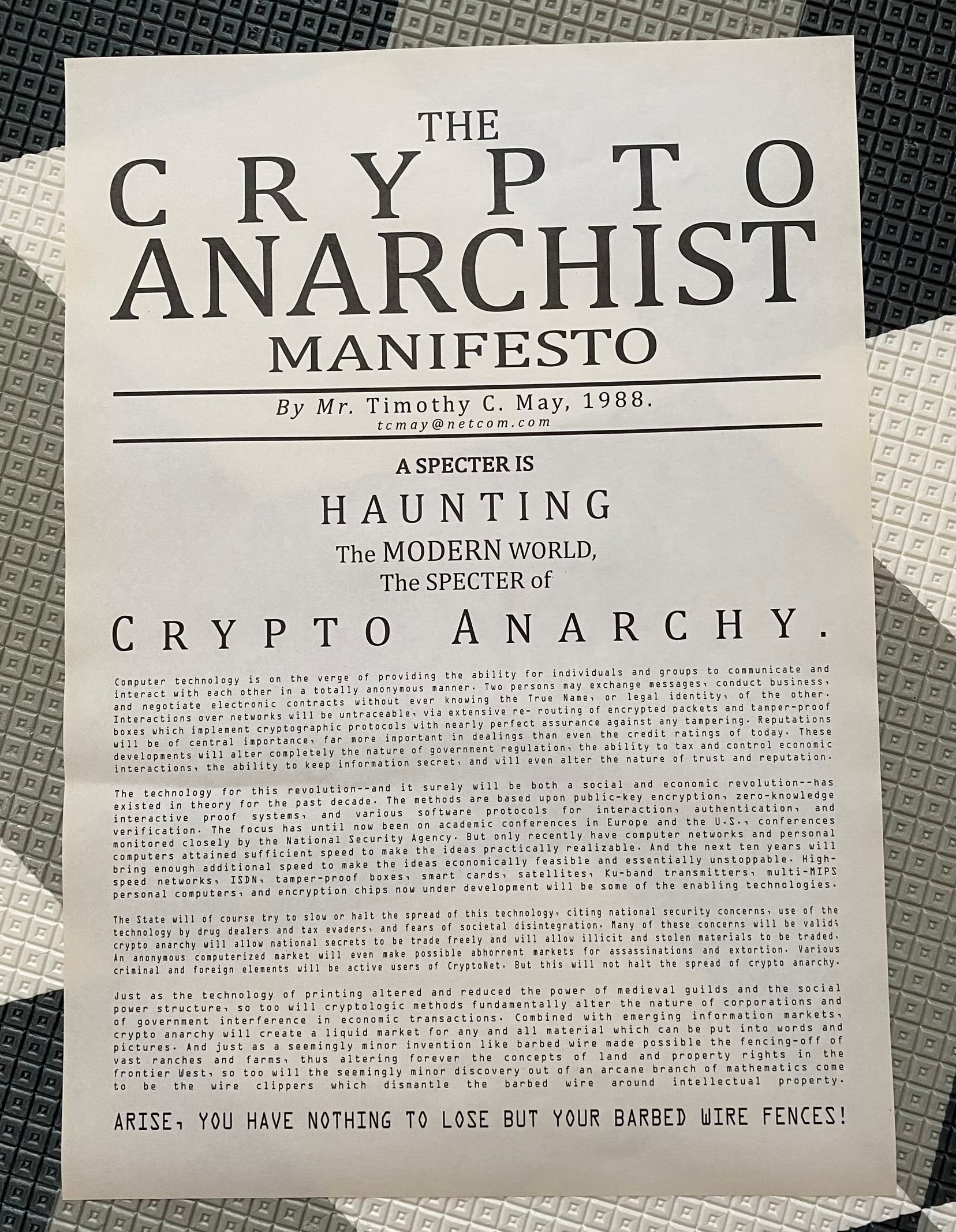 这就是 Timothy C. May 撰写的《The Crypto Anarchist Manifesto》(《加密无政府主义宣言》),被誉为密码朋克(Cypherpunk)运动的精神起点。
